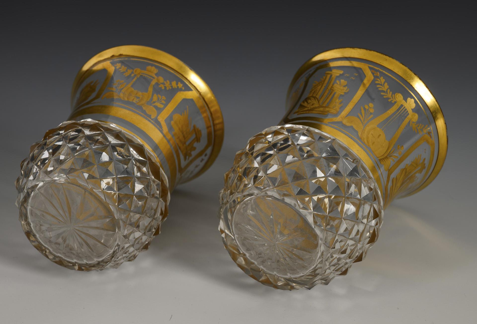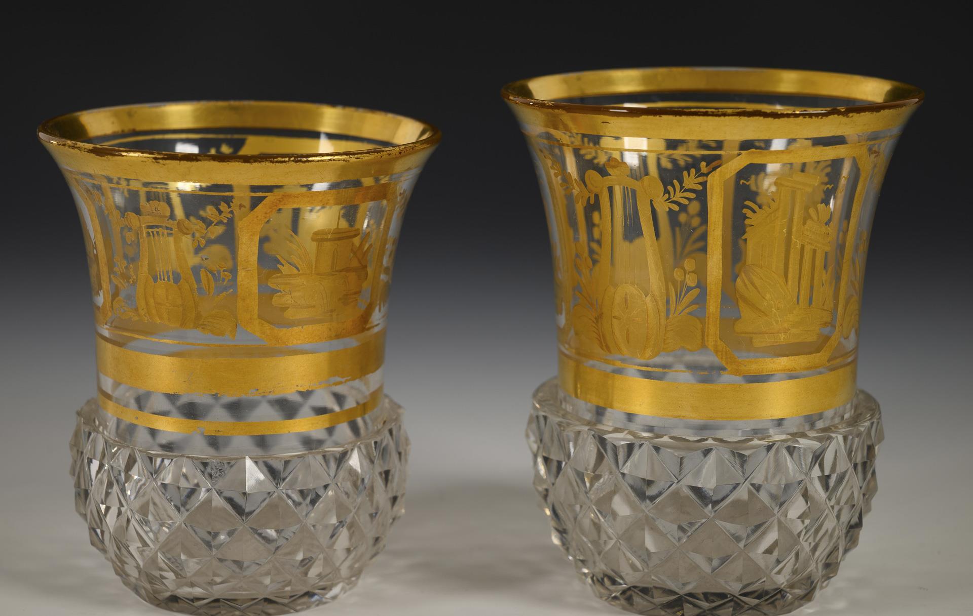 Colorless glass, gold decoration. H 9 and 10 cm.