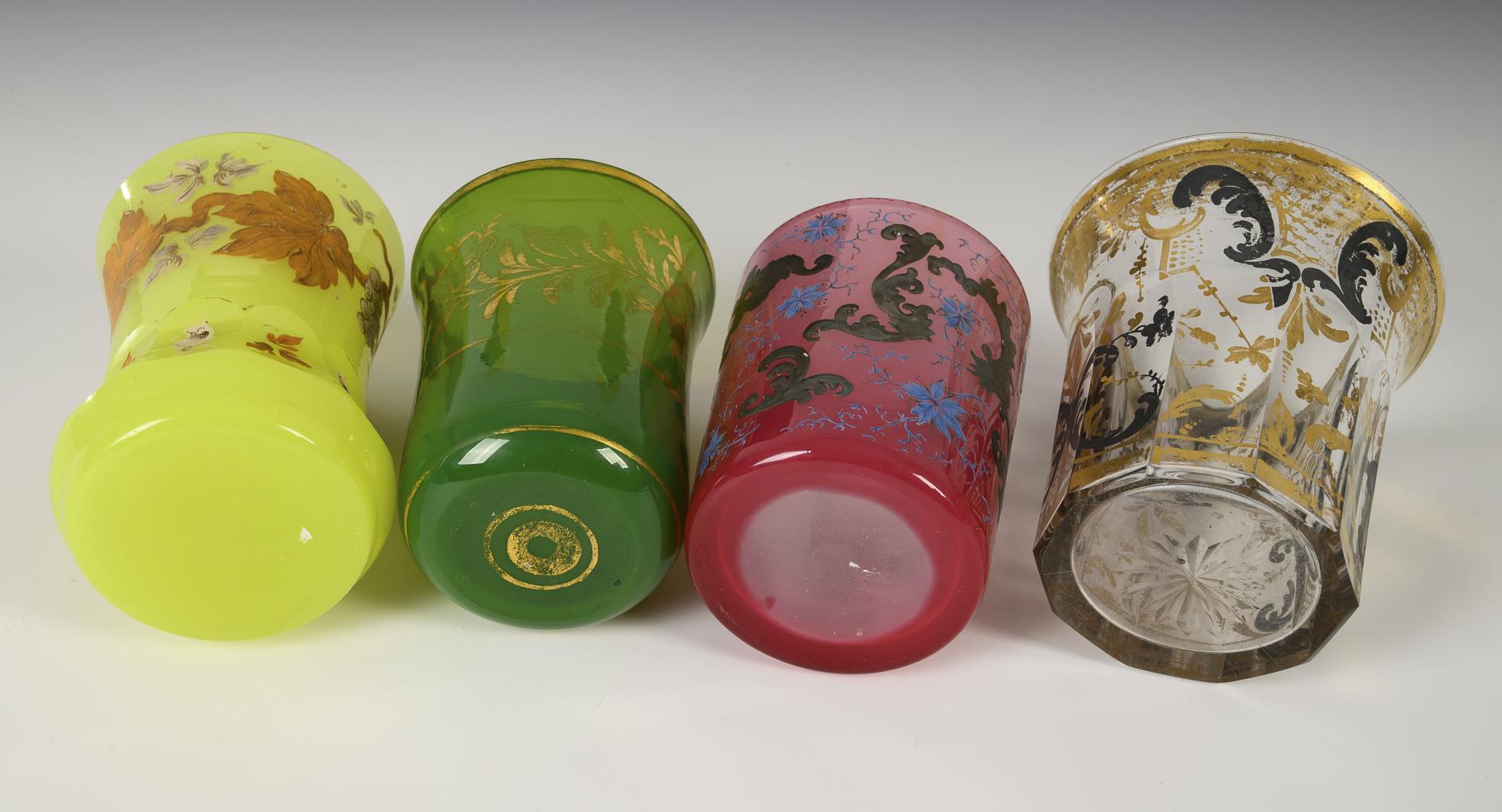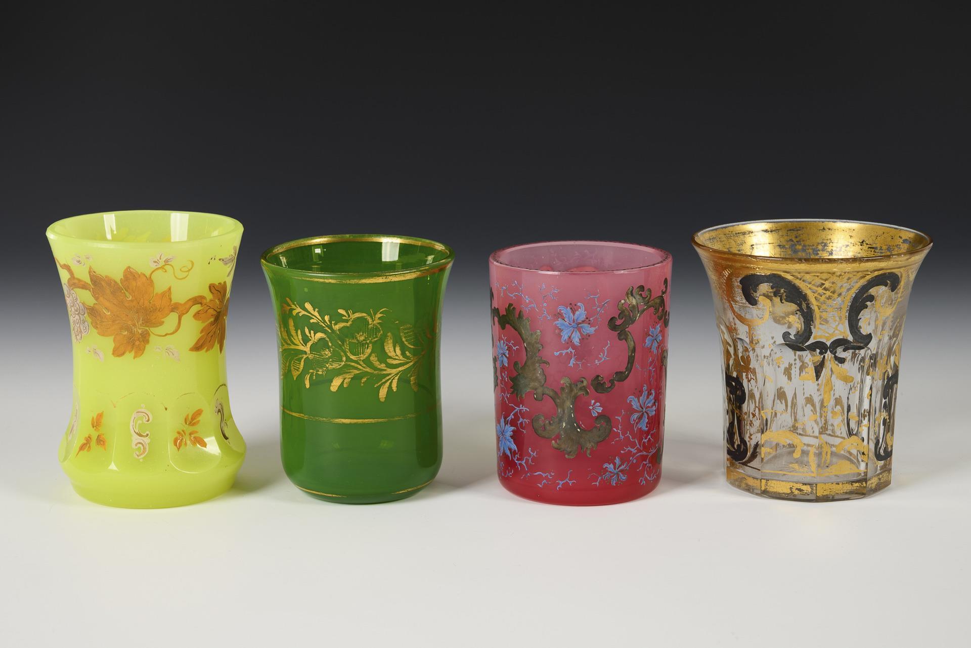 1x uranium glass beaker with enamel-painted and gold heightened vine tendrils (h 10.5 cm). / 1x green glass cylinder mug with flaring rim and floral gold painting (H 9.5 cm). / 1x pink glass cylinder beaker with silver-painted rocailles and blue flowers (H 9 cm) and 1x partly faceted crater beaker with ornamental gold and silver painting (H 9.5 cm). Mainly rubbed.