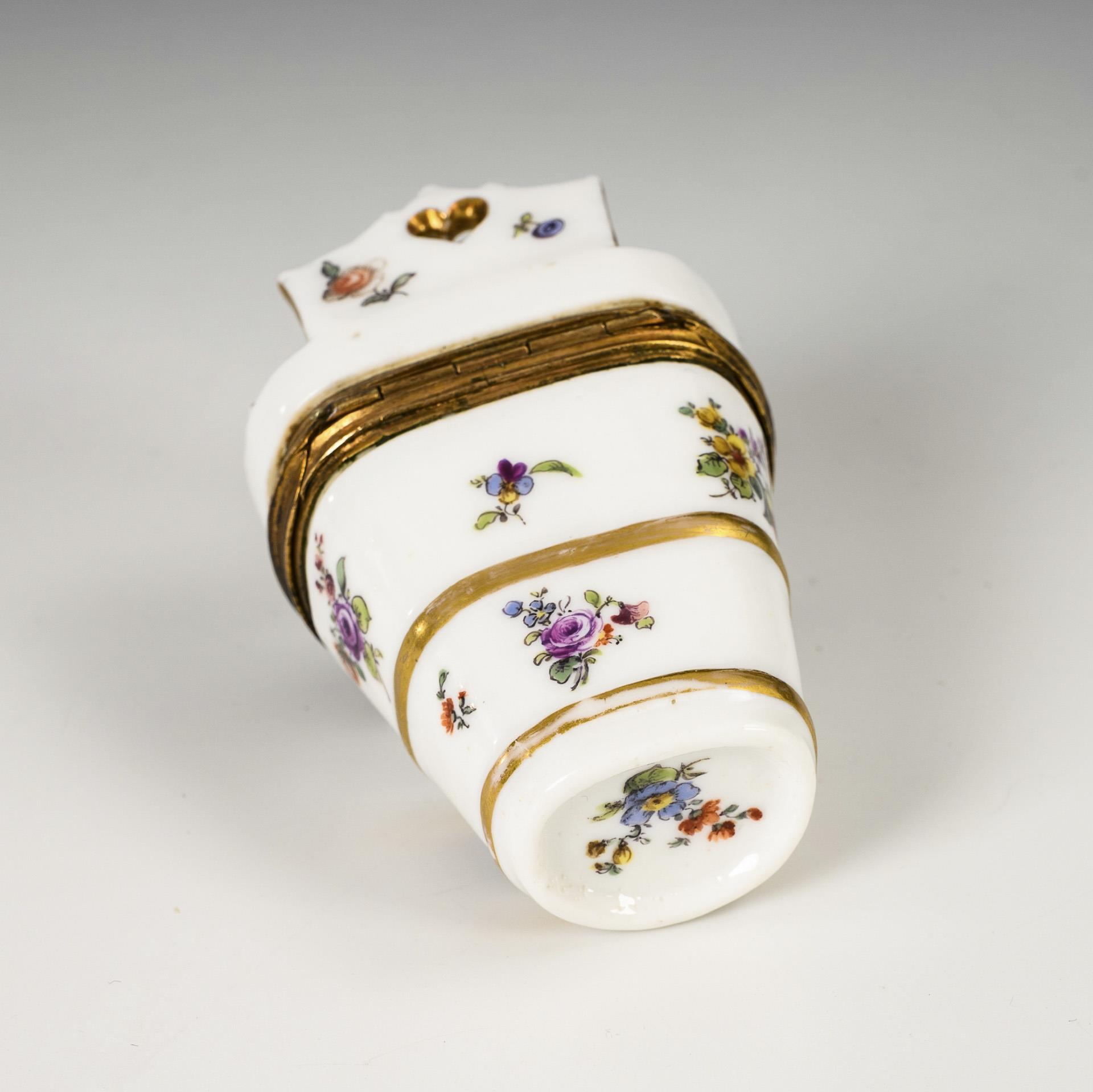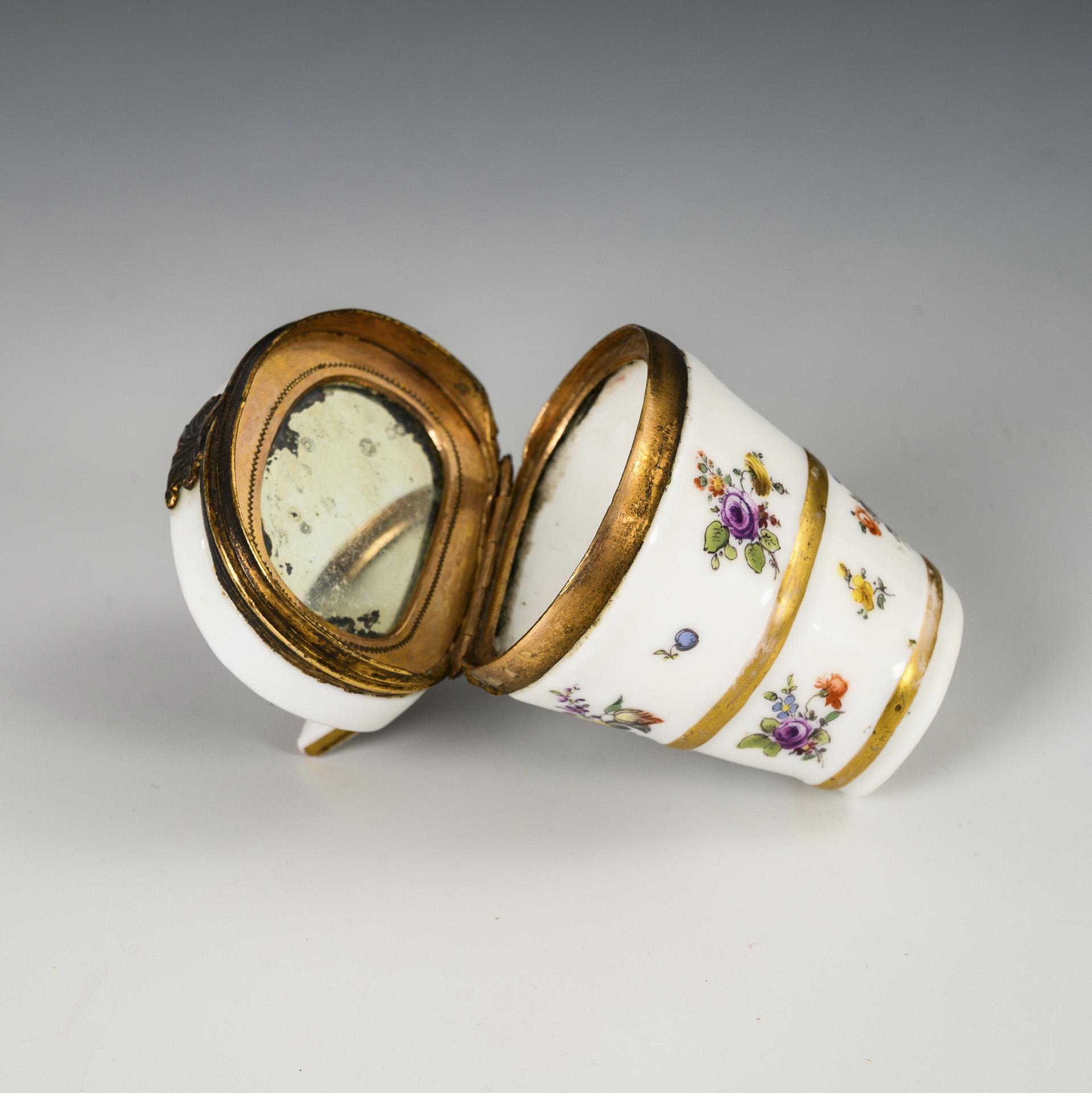 Conical jar with brass-mounted hinged lid. Crafted as a wine jug with a fruit and flower relief on the lid. The box served as a container for the lady's beauty products. There is therefore a small mirror in the lid with which the correct placement of the plasters could be checked. Gold somewhat rubbed.