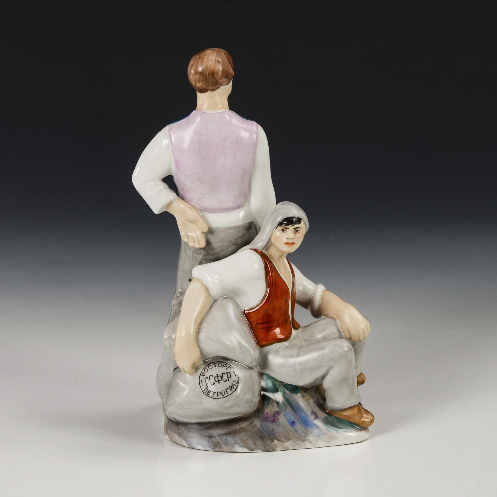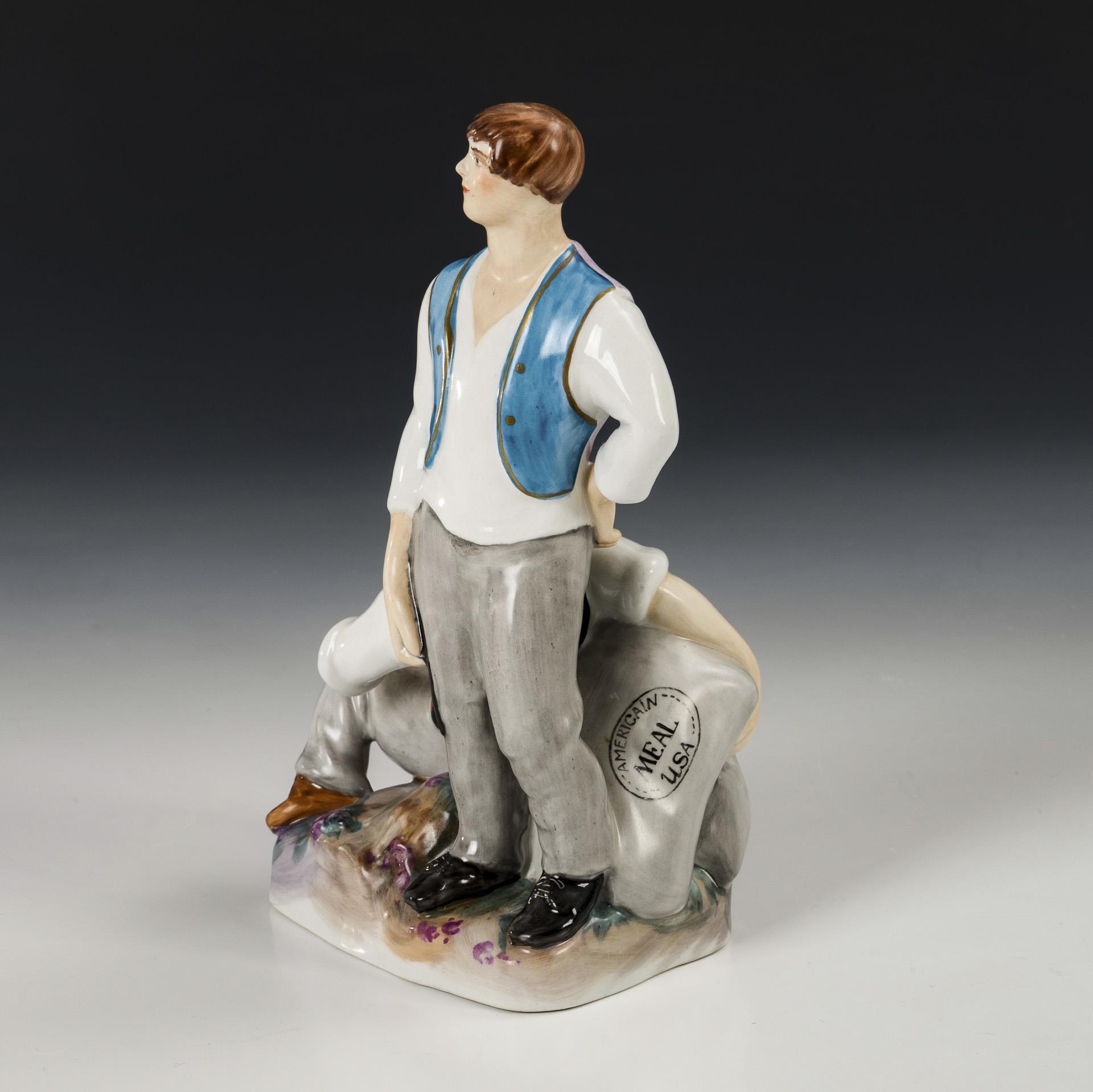 Soviet propaganda group with two dock workers holding sacks of flour, inscribed 1x "American Meal USA" and 1x in Cyrillic "Rostork RSFSR Petrograd".