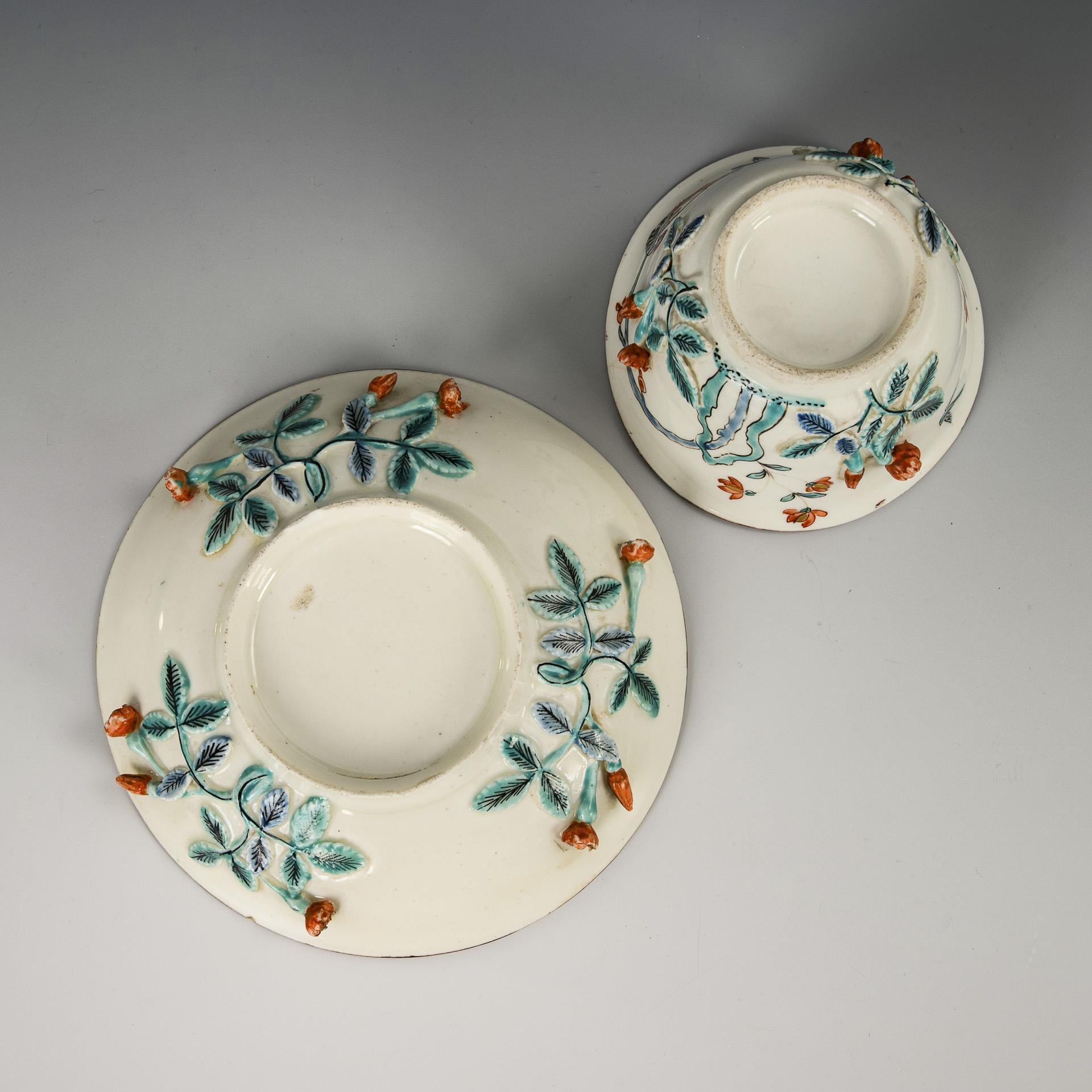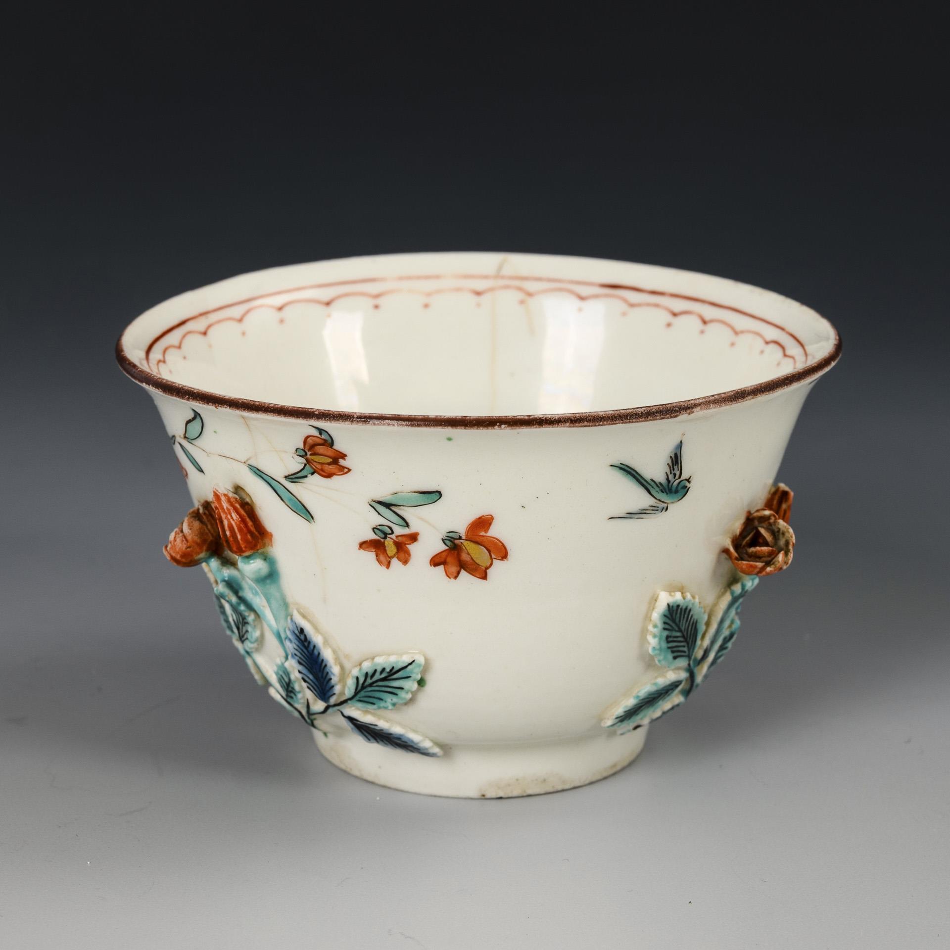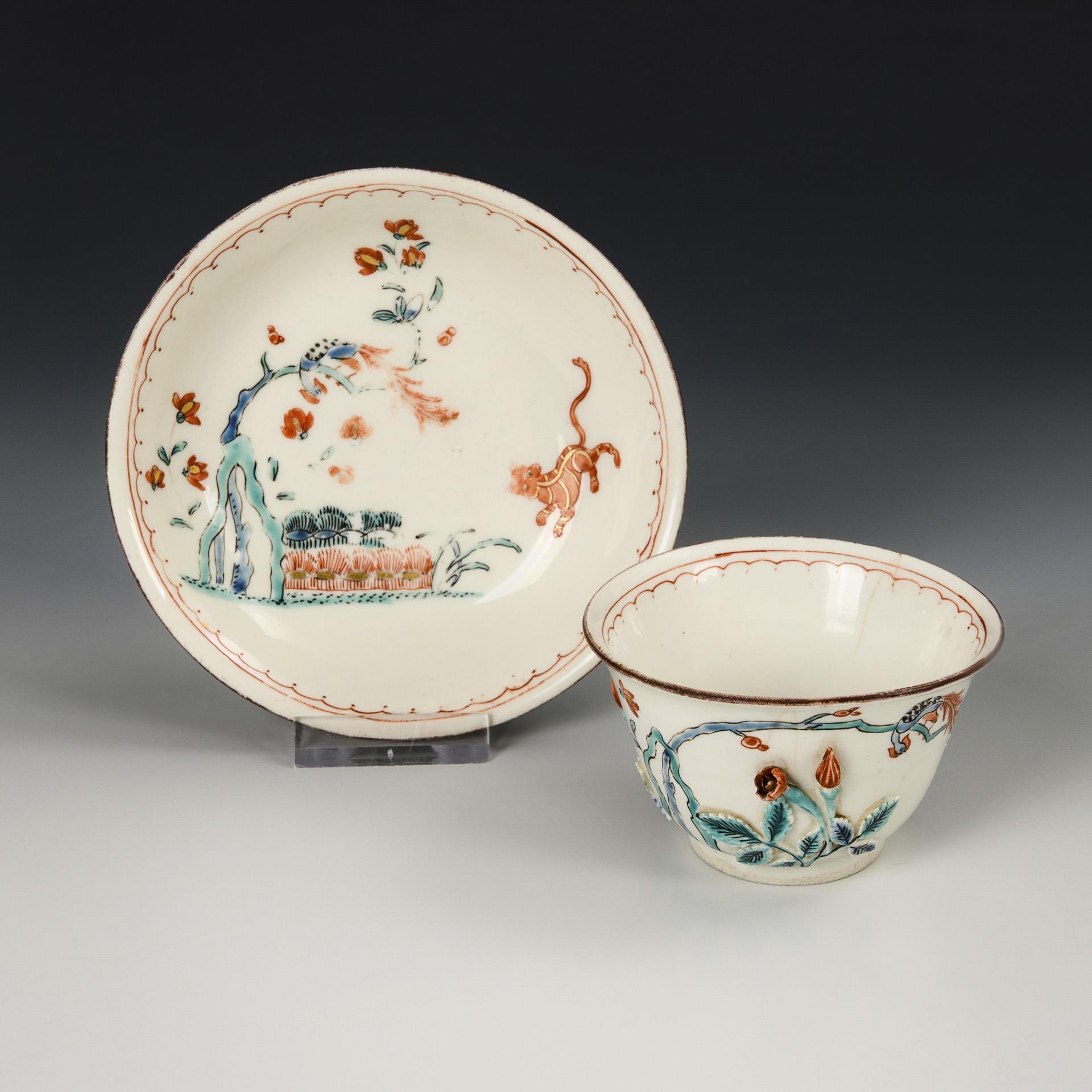Applied flowers on the bowl and saucer as well as kakiemon decoration with pardies bird and lion. Partially somewhat rubbed, 2 hairline cracks in the bowl, minimal chip to the rim of the saucer.