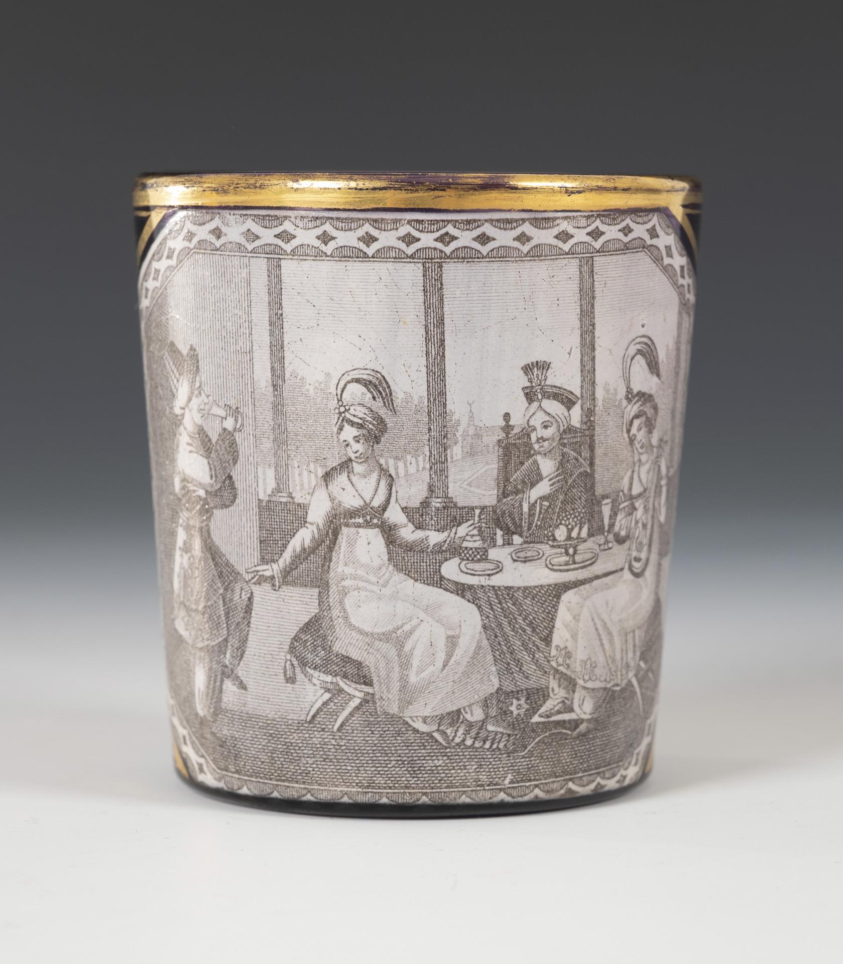 The cups are a typical example of products from the workshop of K. I. Terebenev and P. P. Semechkin workshop, which was active in St. Petersburg in the late 1830s-1840s. The widely known workshop specialized in the decoration of glass, porcelain and earthenware with lithographic drawings. On May 6, 1840, Terebenev and Semechkin were granted a ten-year patent for the use of this technique. They found the motifs for the drawings in Russian and foreign prints and included portraits of famous people, allegorical depictions, literary images and landscapes as well as copies of famous paintings. Similar glasses are kept in the collection of the State Historical Museum in Moscow. Literature : Pressglas-Korrespondenz: PK 2018-1/05, p. 27 ff.; Klesse (1965), p. 64 and 300/Cat. nos. 342 and 343.