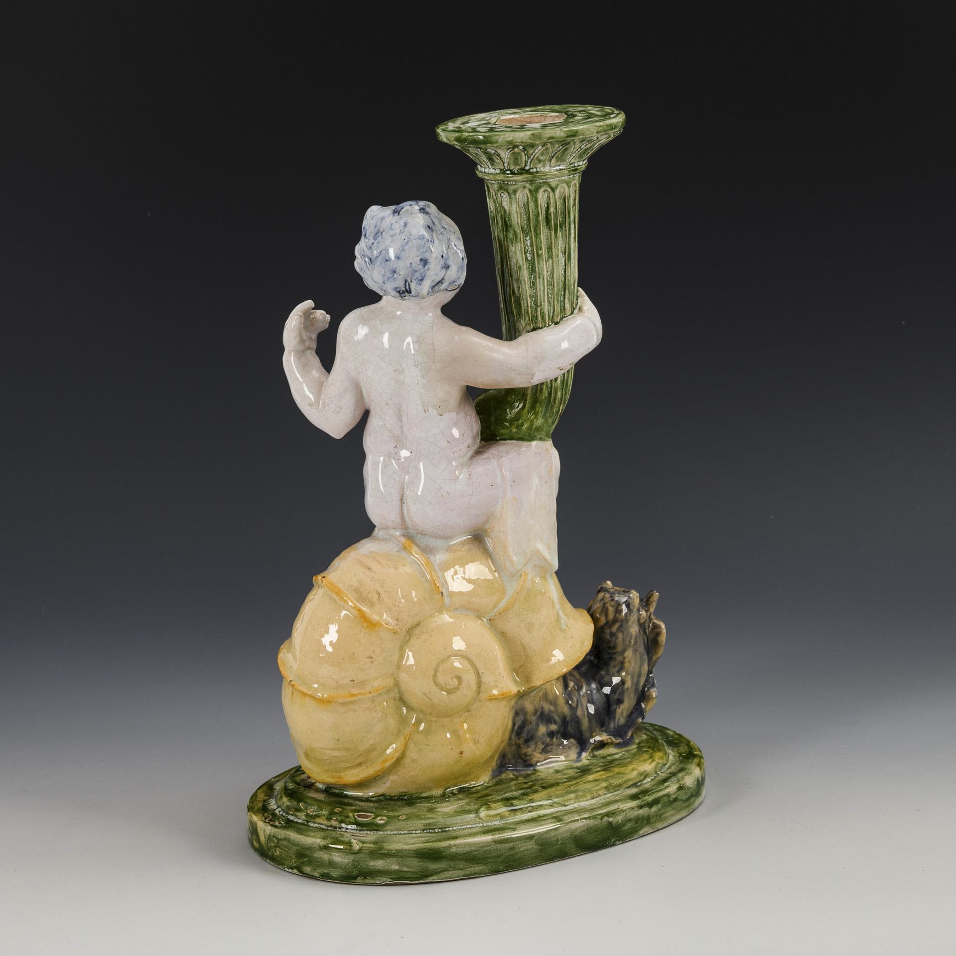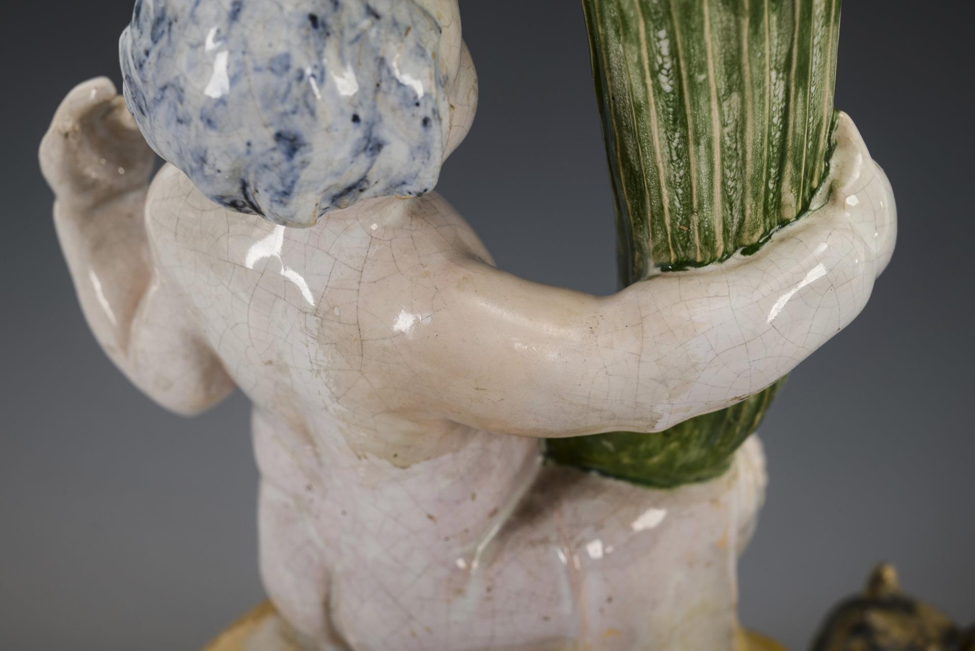 Putto sitting on a scroll with a cornucopia as a single-flame candlestick, on an oval base. Restored on the arm, some glaze defects, partially slightly chipped.