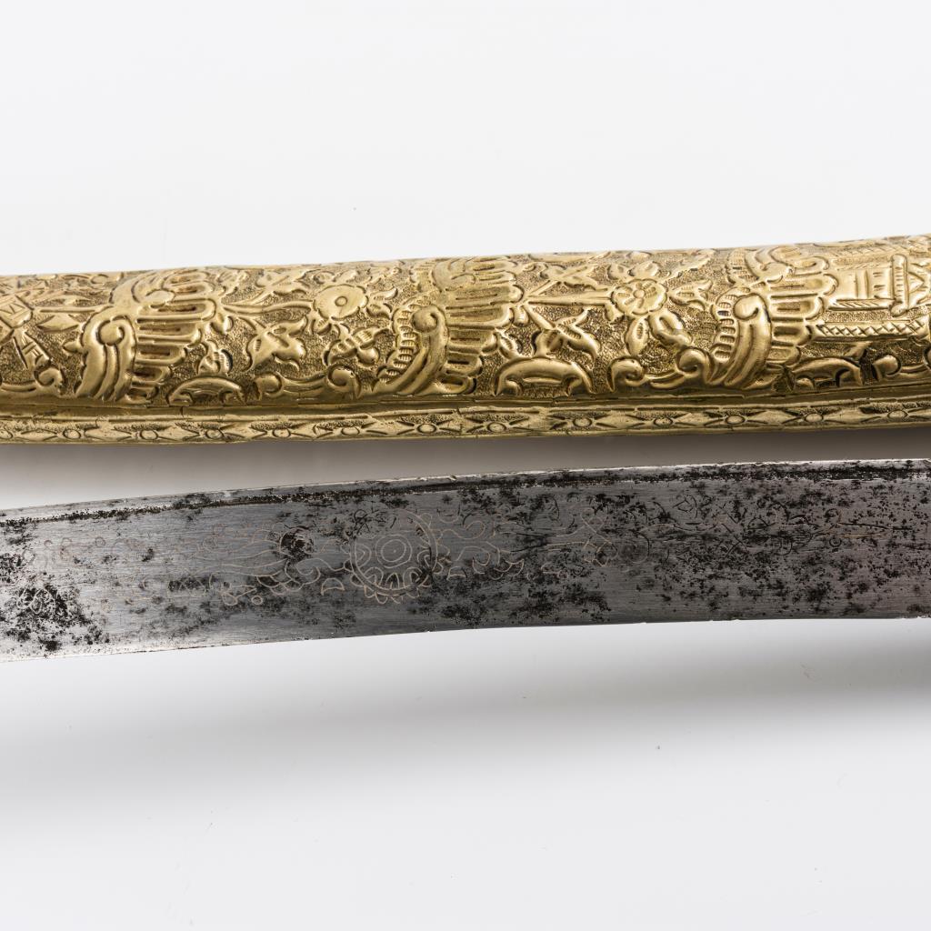 Klinge mit feiner Einlegearbeit, Beingriff mit gerippten Korallen besetzt und zwei grüne Steine. Getriebene Messingscheide wohl etwas jünger. Altersspuren, aber gute Erhaltung.