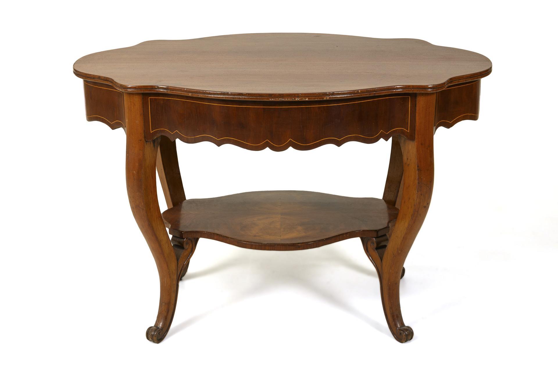 Mahogany, solid and veneered, light contouring thread inlays. Approx. 73 x 112 x 71 cm.