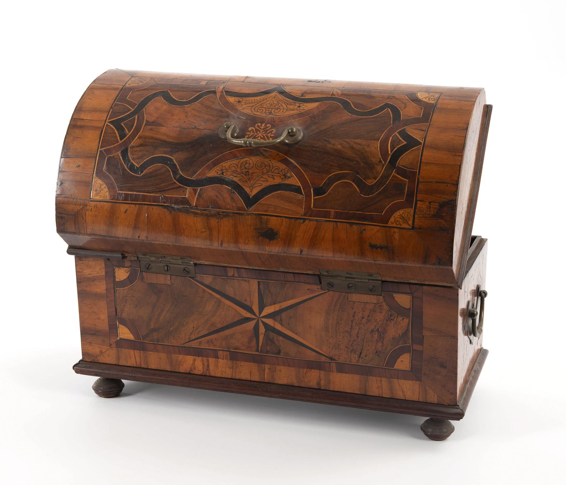 Casket standing on ball feet with handles on the sides and on the round lid. Decorated on all sides and on the lid with branded mock caskets; the front similar to a finch chest with birds on branches, the lid with intertwined ribbon inlays, the sides with branches and the back with a star. Lid knob and lid edge strip at the back missing, restored with some additions (e.g. fittings, lock and mother-of-pearl), some signs of age/use.