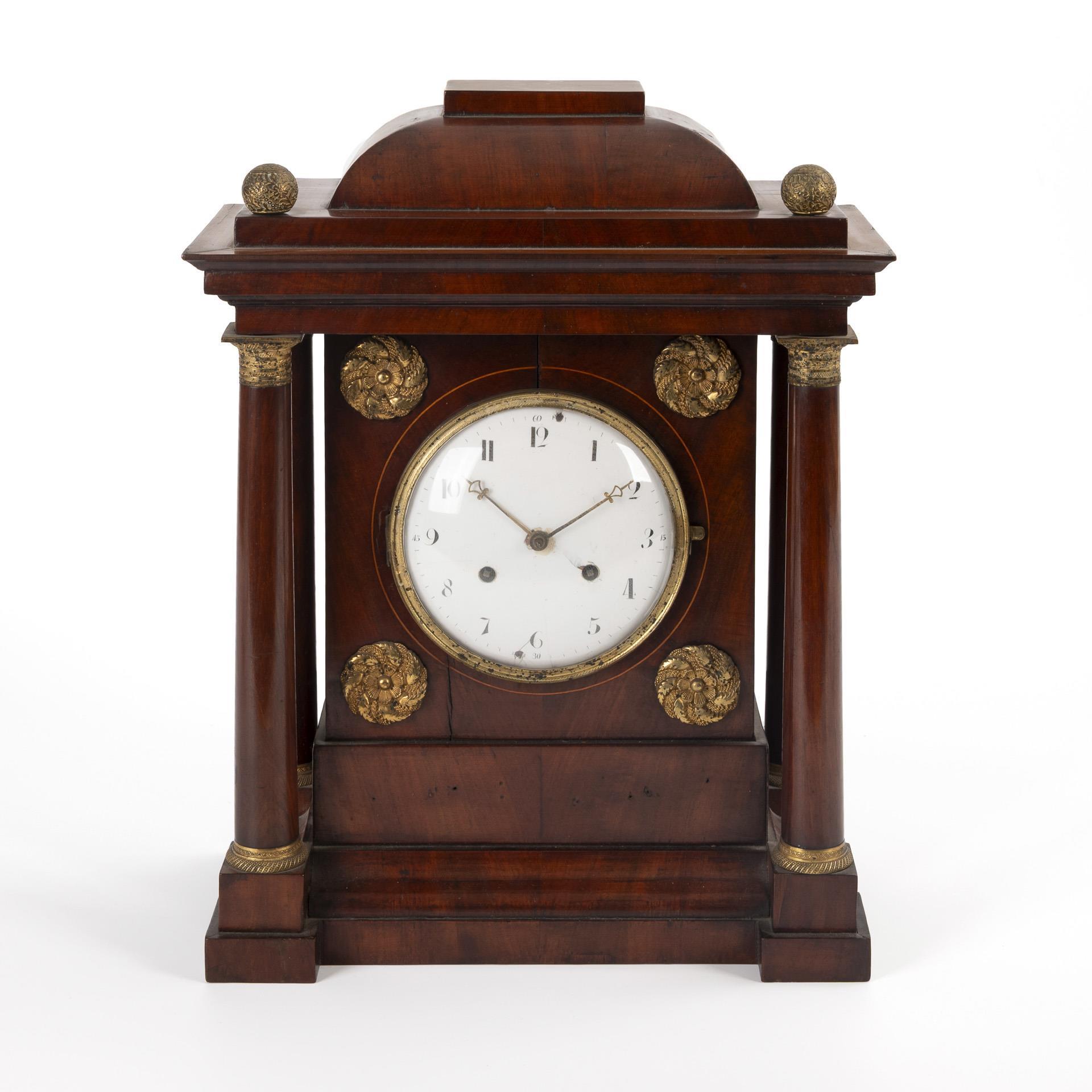 Architectural case with hipped roof and 4 full columns on the sides, on a stepped base with wavy edge. Crowning chased brass spheres, rosettes, column capitals and bases. Signs of age and wear, slight veneer defects, cracks, partial additions to the veneer, clock face with hairline cracks and chipped enamel.