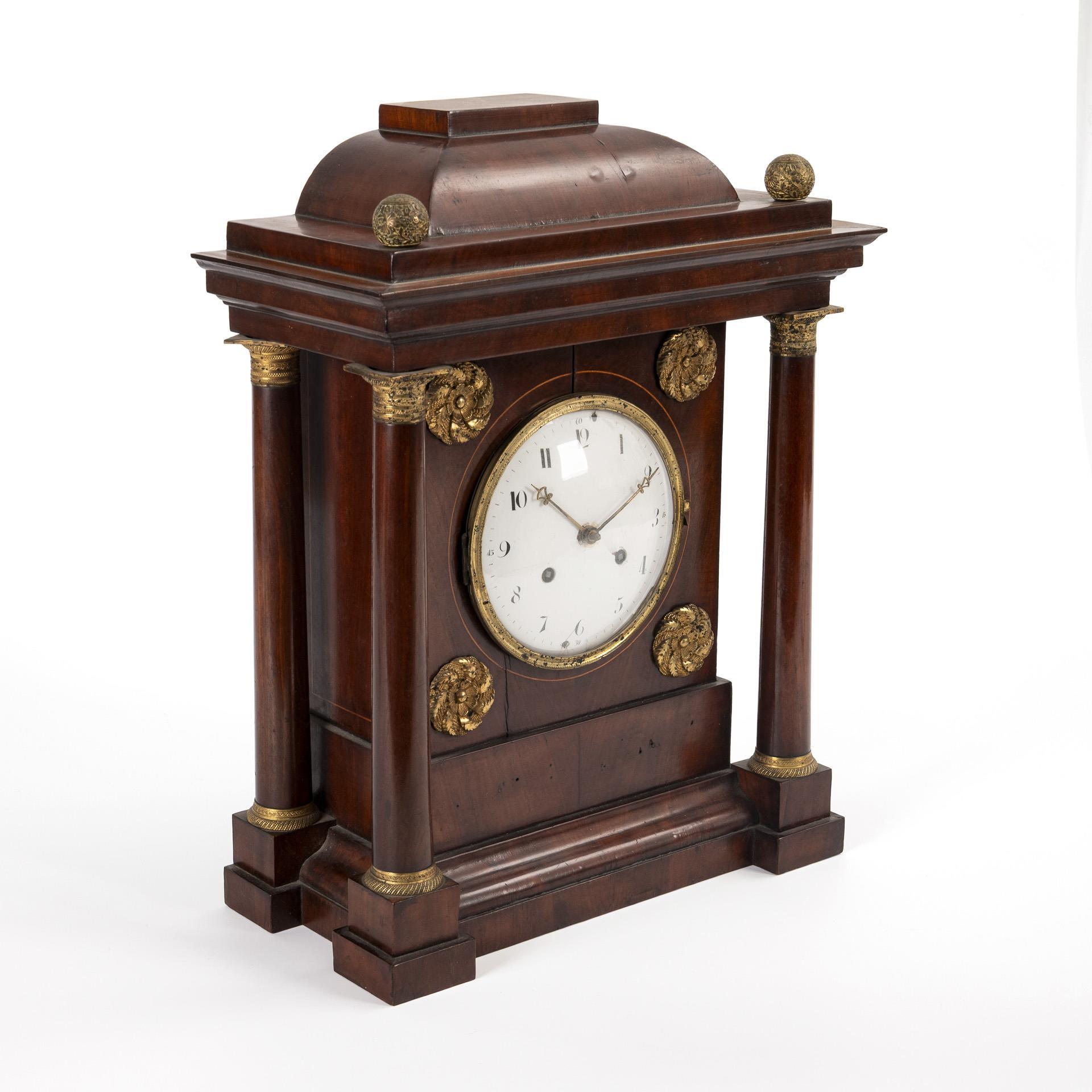 Architectural case with hipped roof and 4 full columns on the sides, on a stepped base with wavy edge. Crowning chased brass spheres, rosettes, column capitals and bases. Signs of age and wear, slight veneer defects, cracks, partial additions to the veneer, clock face with hairline cracks and chipped enamel.