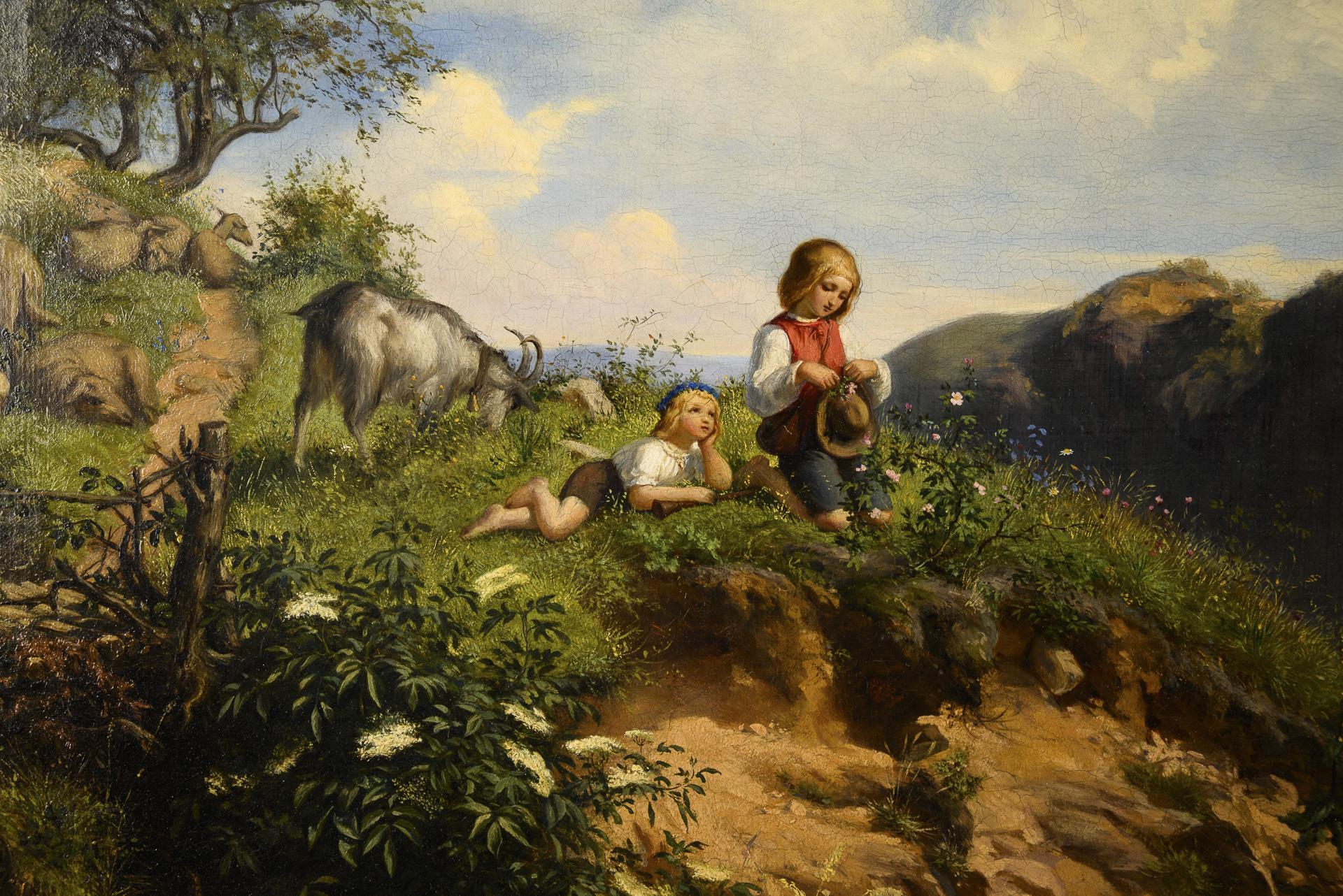 Two children with the goats and sheep on a mountain in the sunshine above the farmhouse. Minimal traces of age.