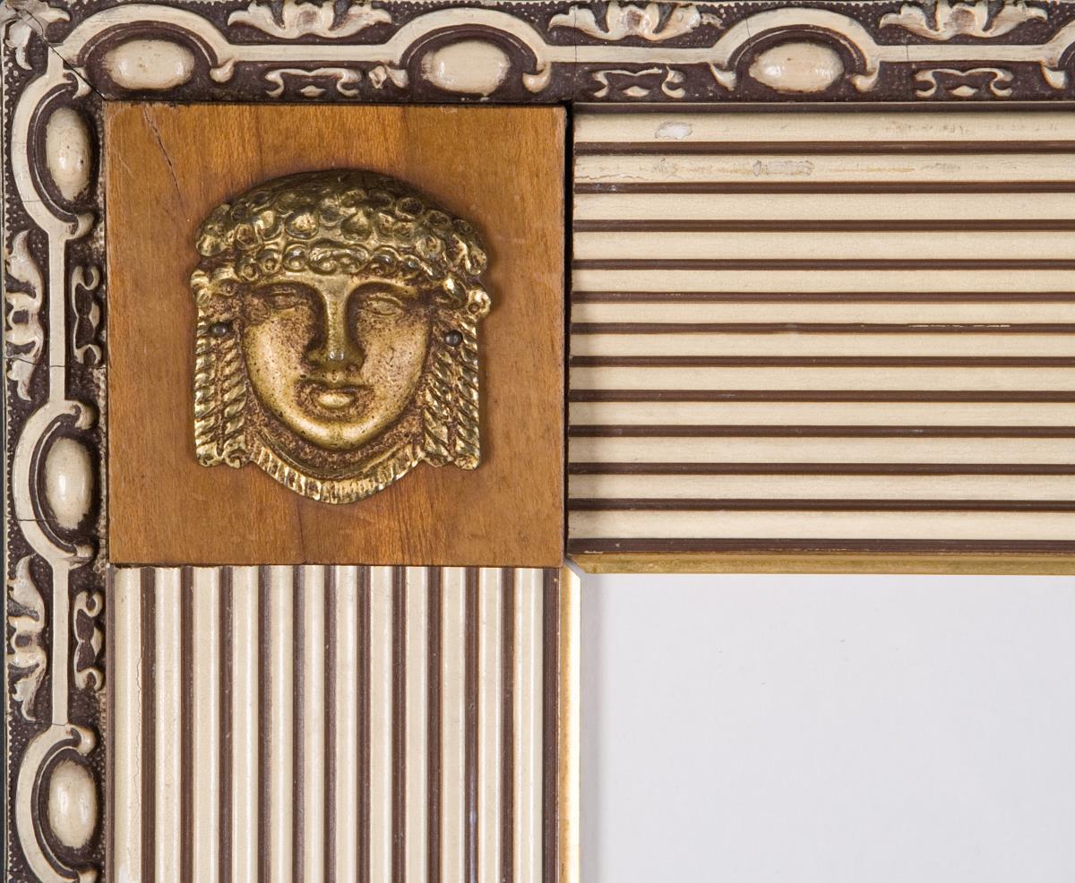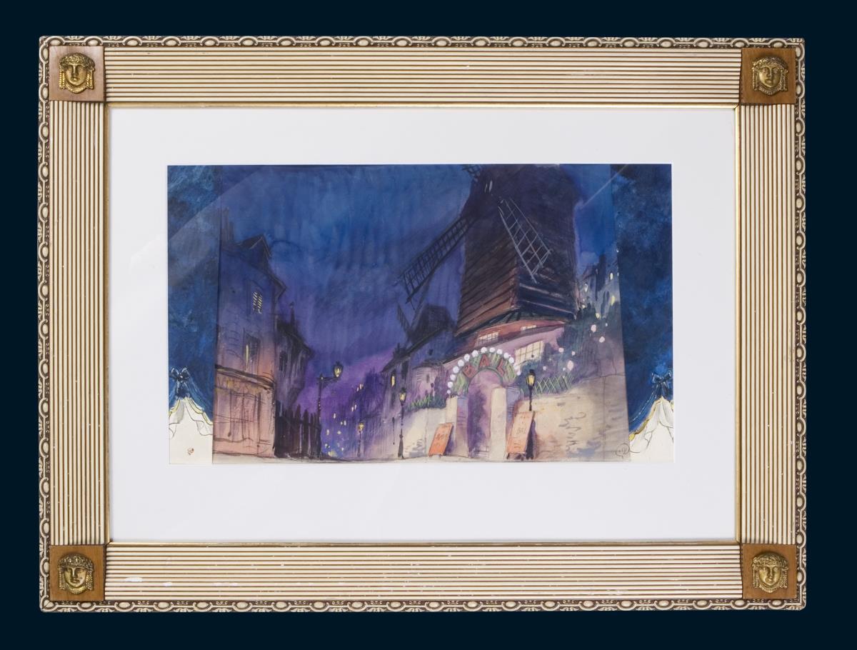 Varieté Theater, Cabaret im Pariser Stadtviertel Montmatre. Seitlich lose bemalte Vorhang-Streifen mit Monogramm-Stempel. Verglaster Stuckrahmen mit applizierten Holz-Ecken und Messing-Köpfen.