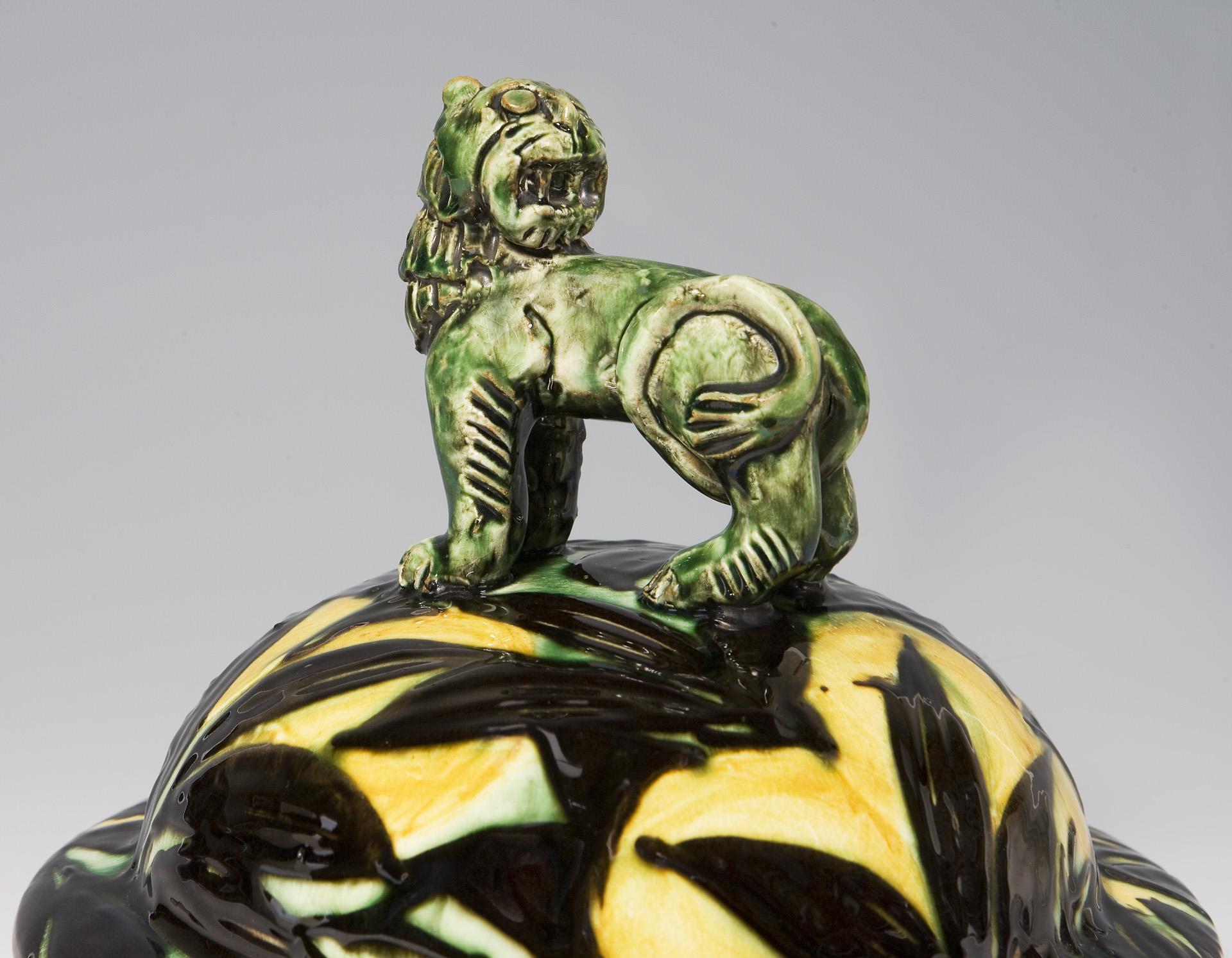 Painted in green, yellow and black. Lid with sculpted lion as a crowning feature. Press marks.