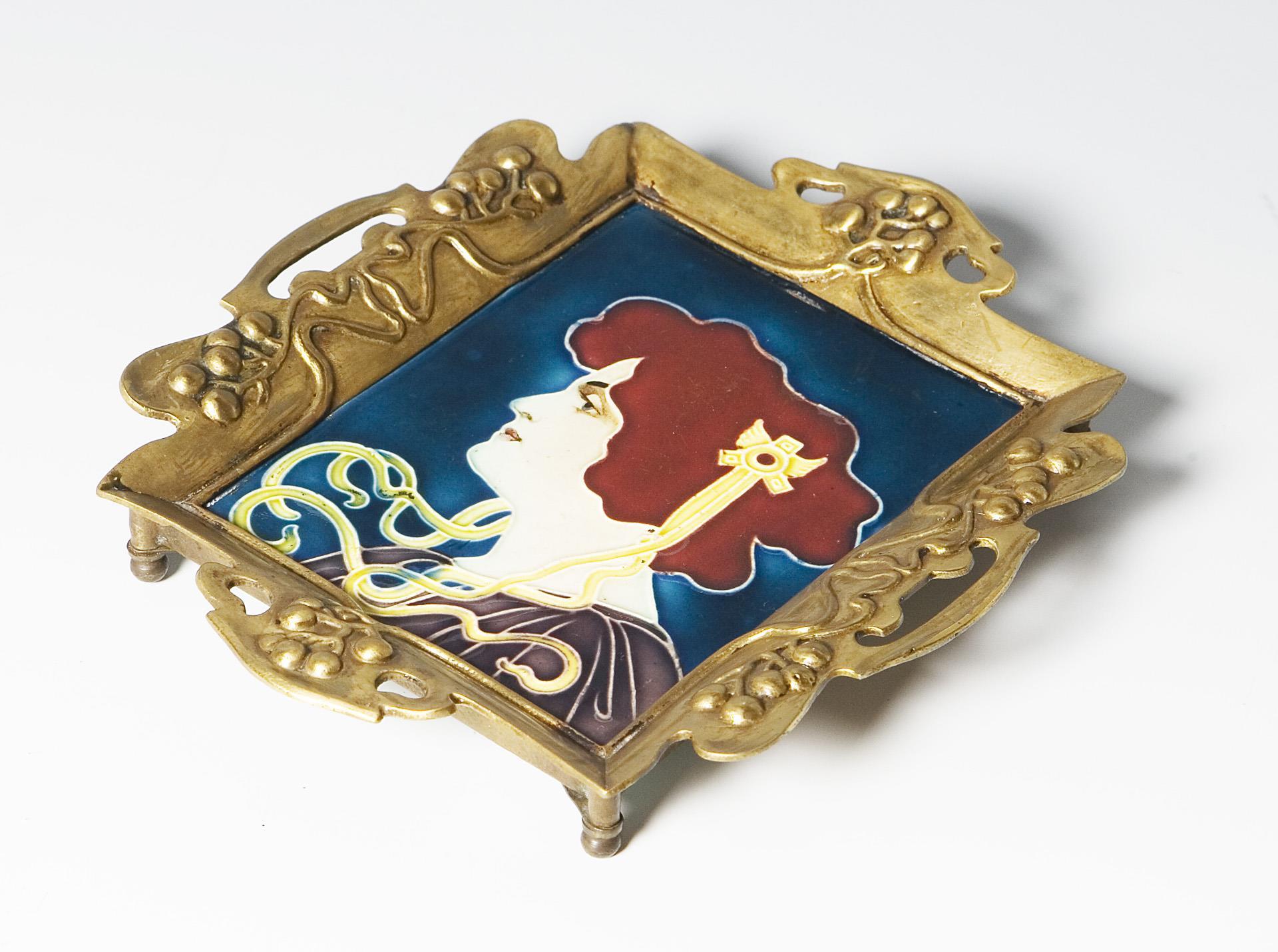 Small Art Nouveau tile in metal frame. Johann von Schwarz, Nuremberg.