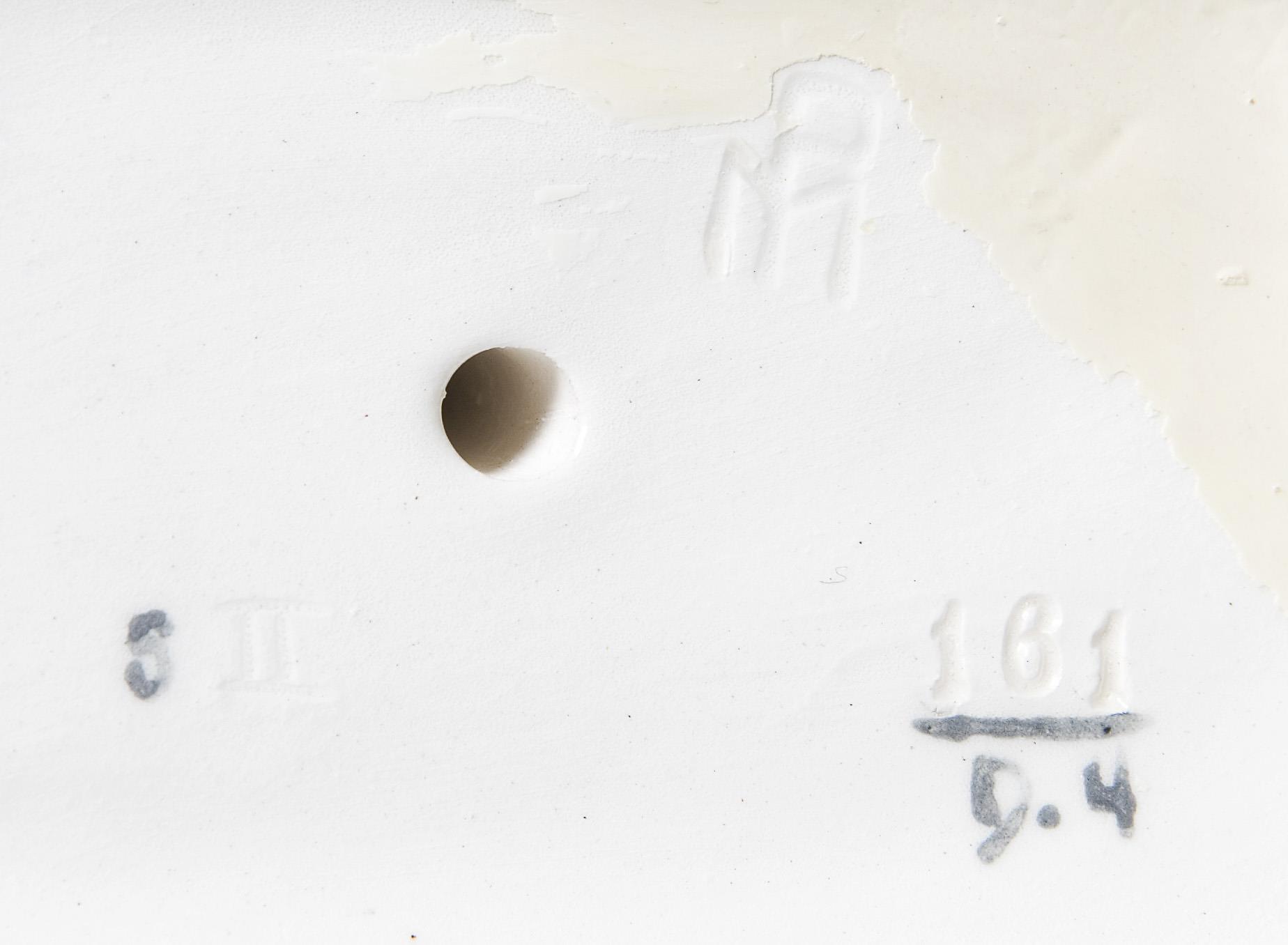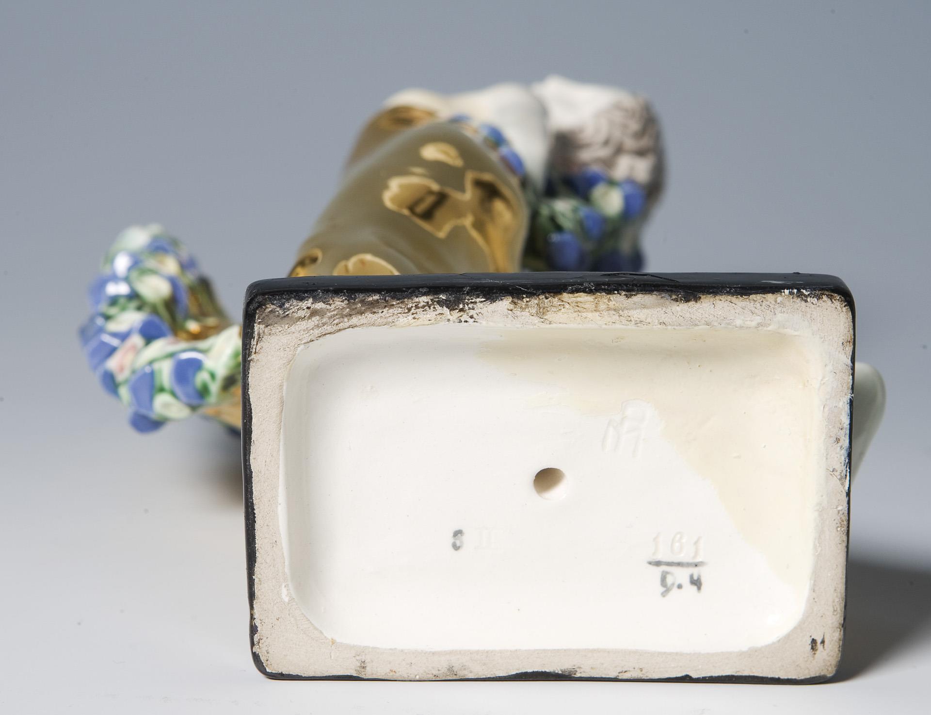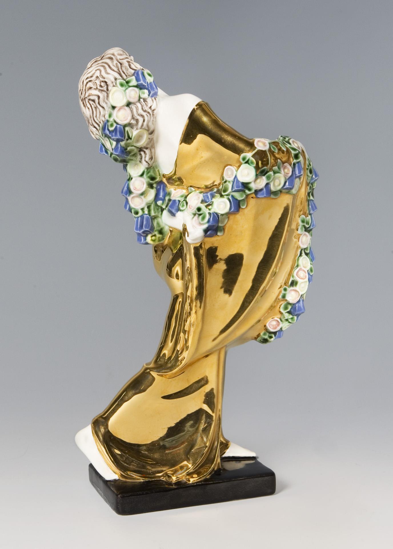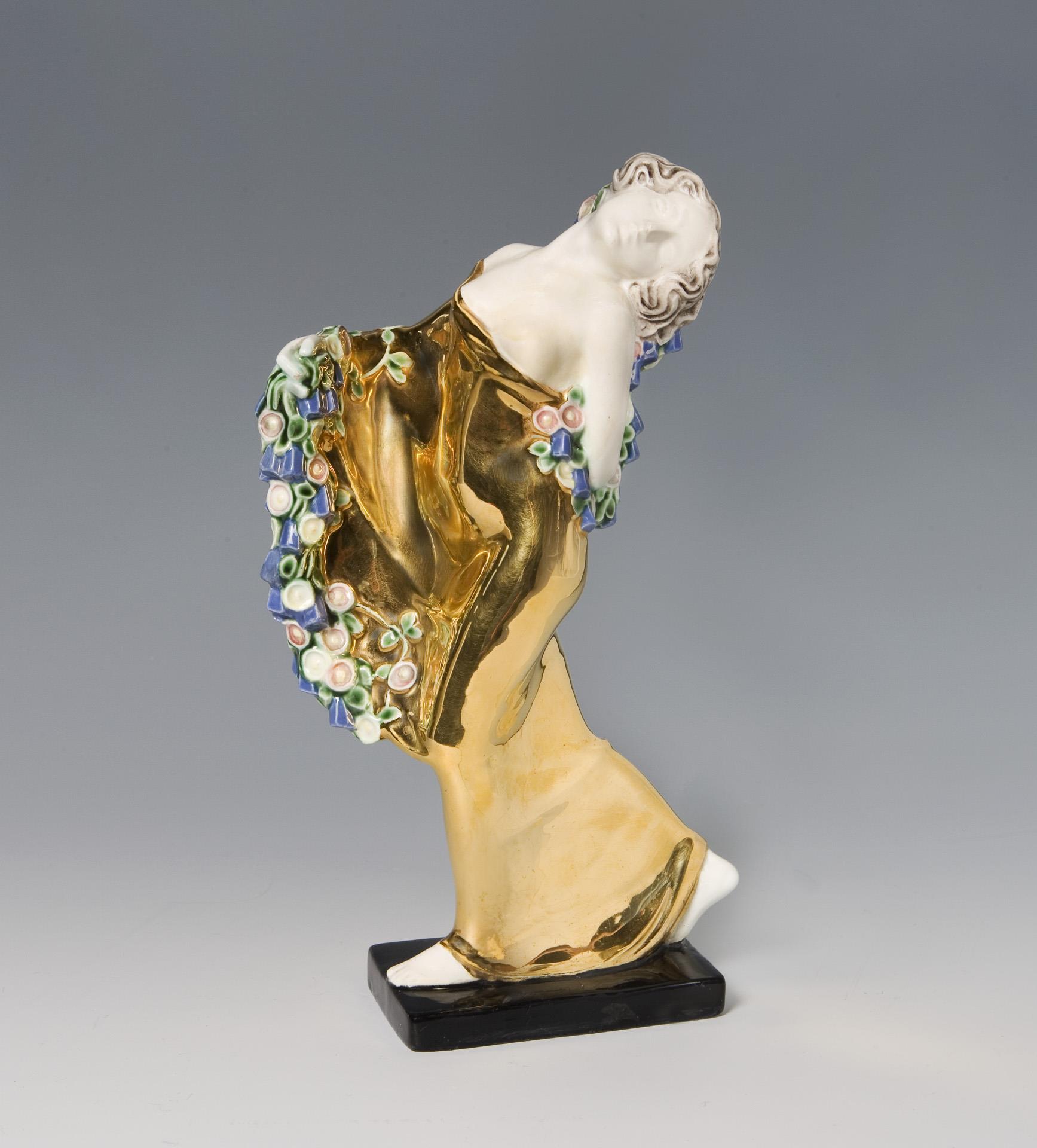 Colored underglaze painting, gold fond, base with black fond. Artist's signet, model number, painter's mark. One breast, base with partially visible old restoration, small gold abrasion at the bottom, garland minimally chipped.