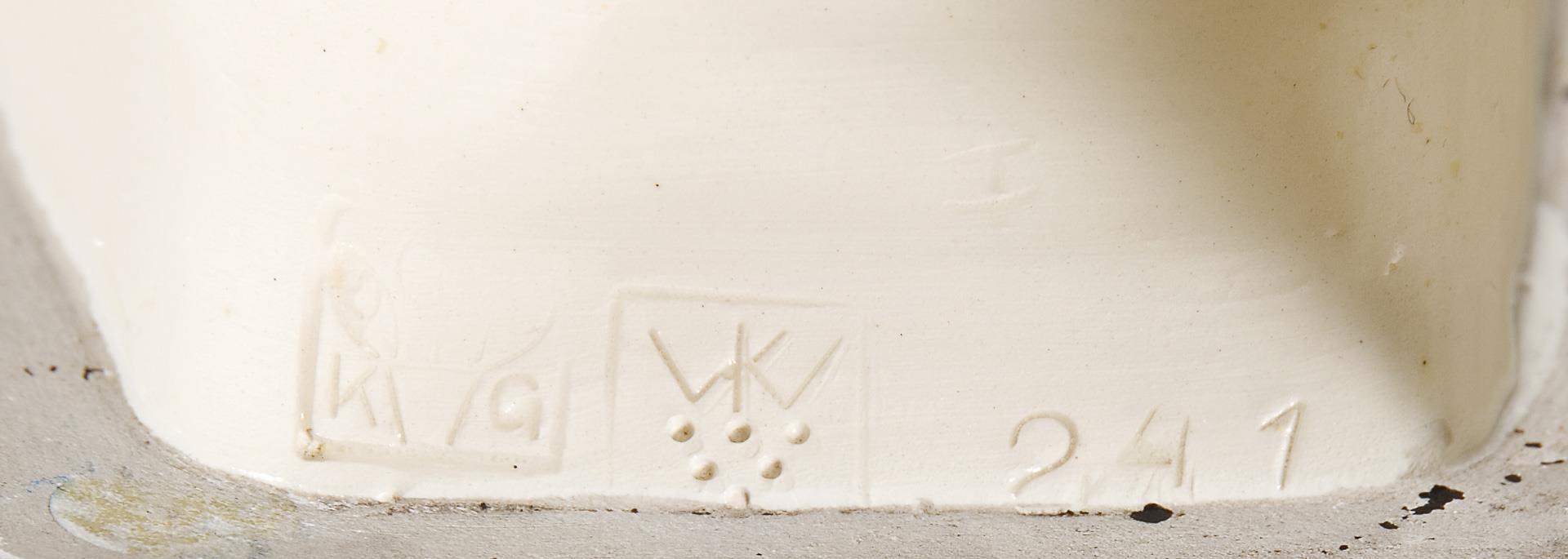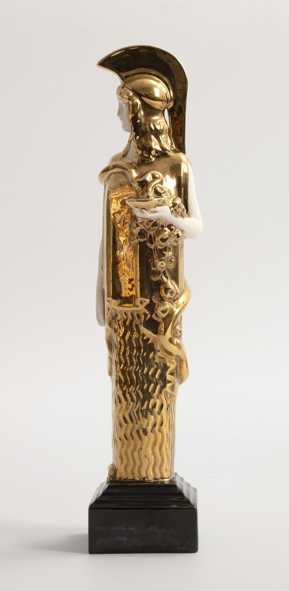 The model by Powolny was created in collaboration with Bertold Löffler (1874 Nieder-Rosnthal - 1960 Vienna). Gold background, base with black background. Company marks with model number. Minimal wear, one arm with minimal glaze cracks.