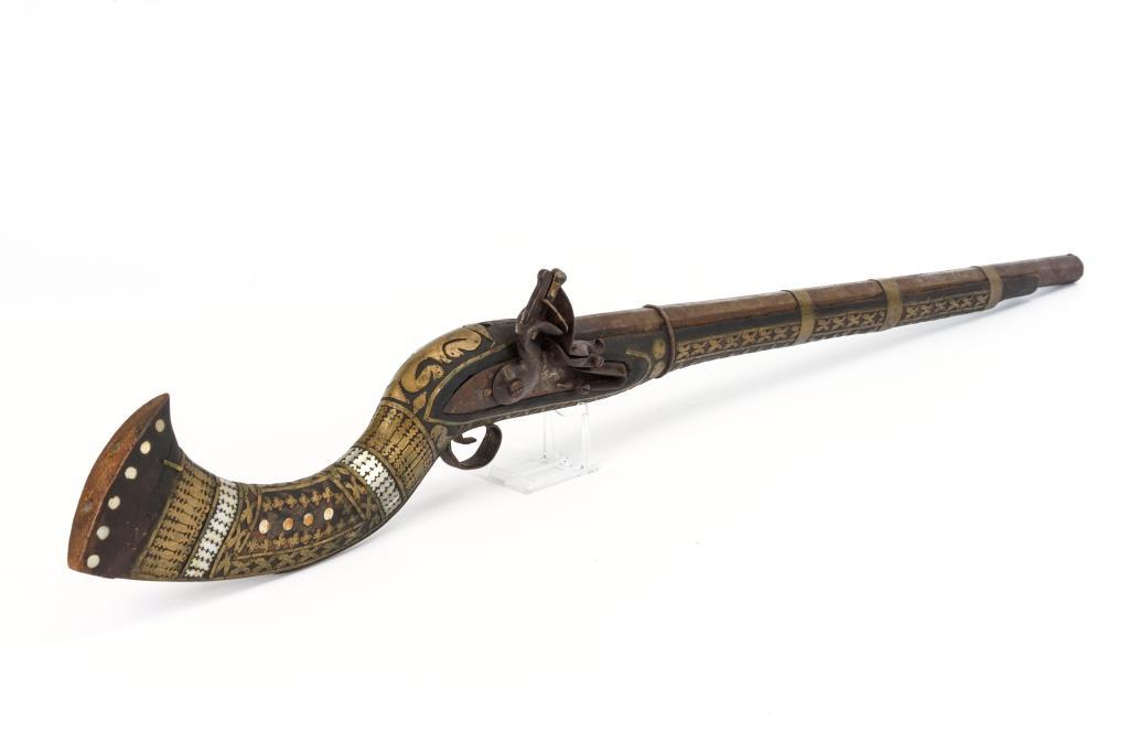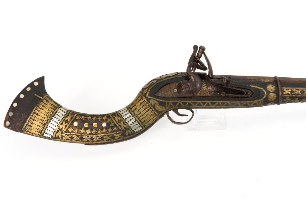 Achteckiger gezogener Lauf mit Kimme und Korn. Schaft und Kolben mit Perlmutt- und Messingintarsien bzw. Auflagen. Mechanik schwergängig, Lauf mit Korrossionsspuren.