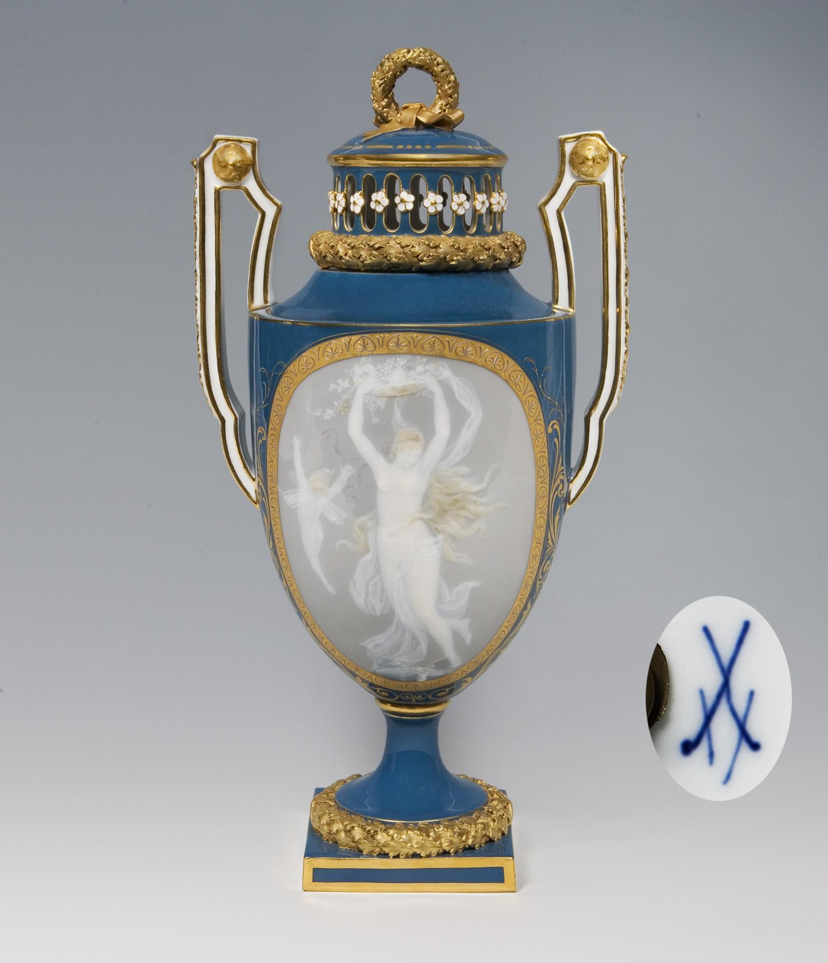 Mold model by Christian Gottfried Jüchtzer and collaborators. Model year: 1782-1785 (mold), pâte-sur-pâte decoration around 1900. Floral relief, medium blue ground, rich gold decoration. Frontal "Floating Flora with Cupid" in large oval reserve. Mounted round foot over a square plinth. Incised mark, impressed mark, sword mark. Cover plate expertly restored.