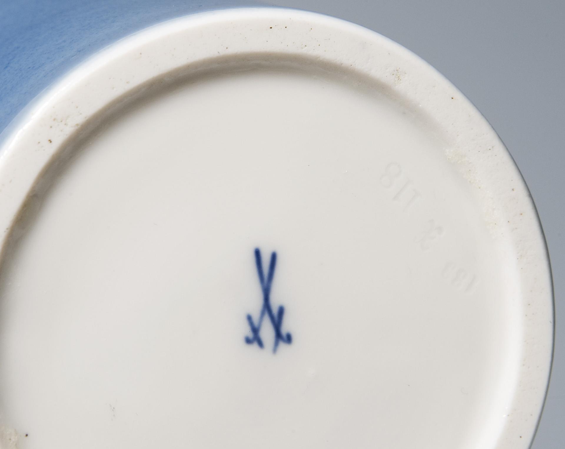 Medium blue ground, water lily decoration on both sides, gold staffage. Press marks, sword mark, artist's signet.