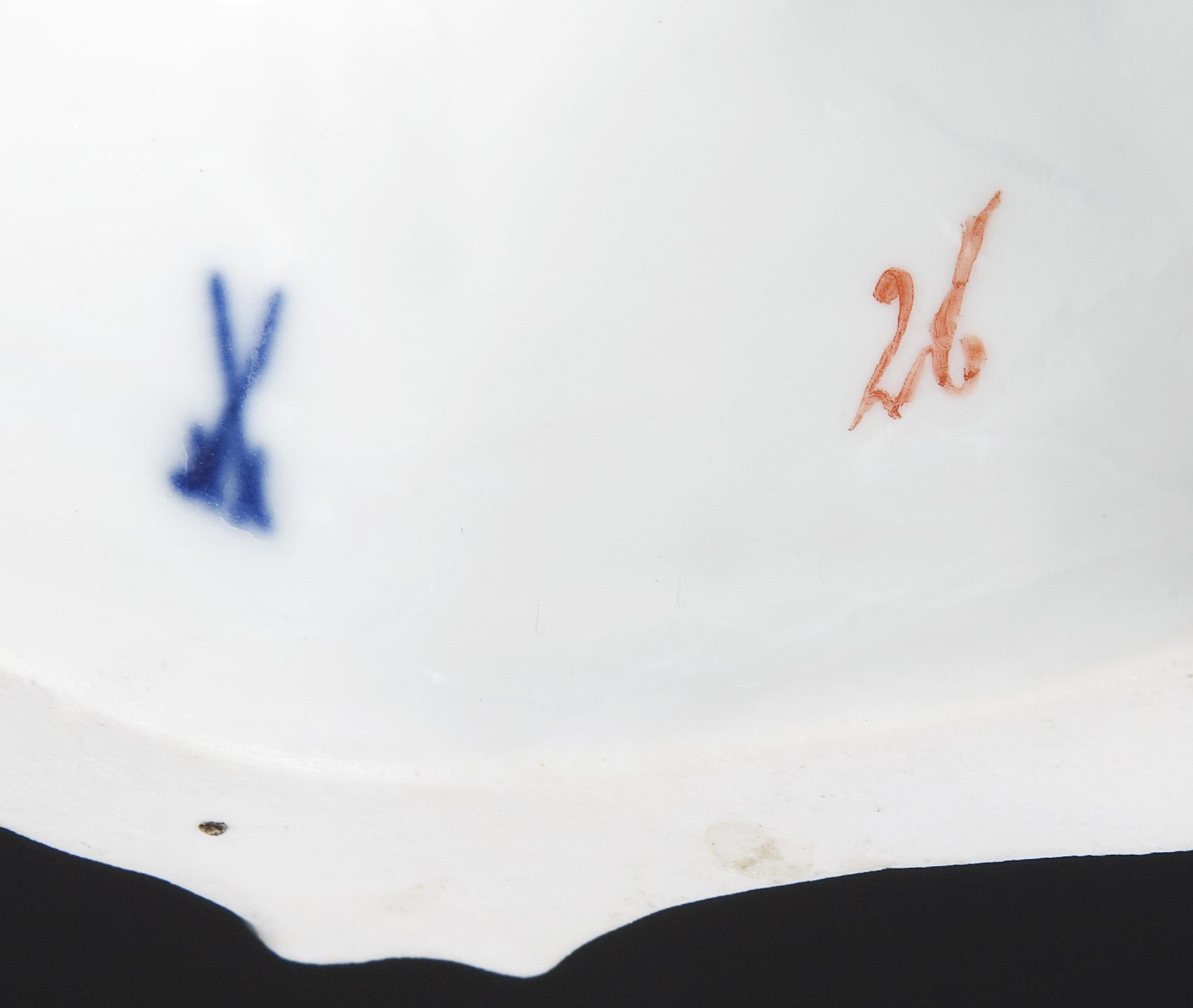 Painted in color, painted gold. Incised mark, impressed mark, painter's mark, sword mark. Two fingers, a few restored leaves, one leaf chipped, one small corner of the base repaired by the manufactory before the staffage.