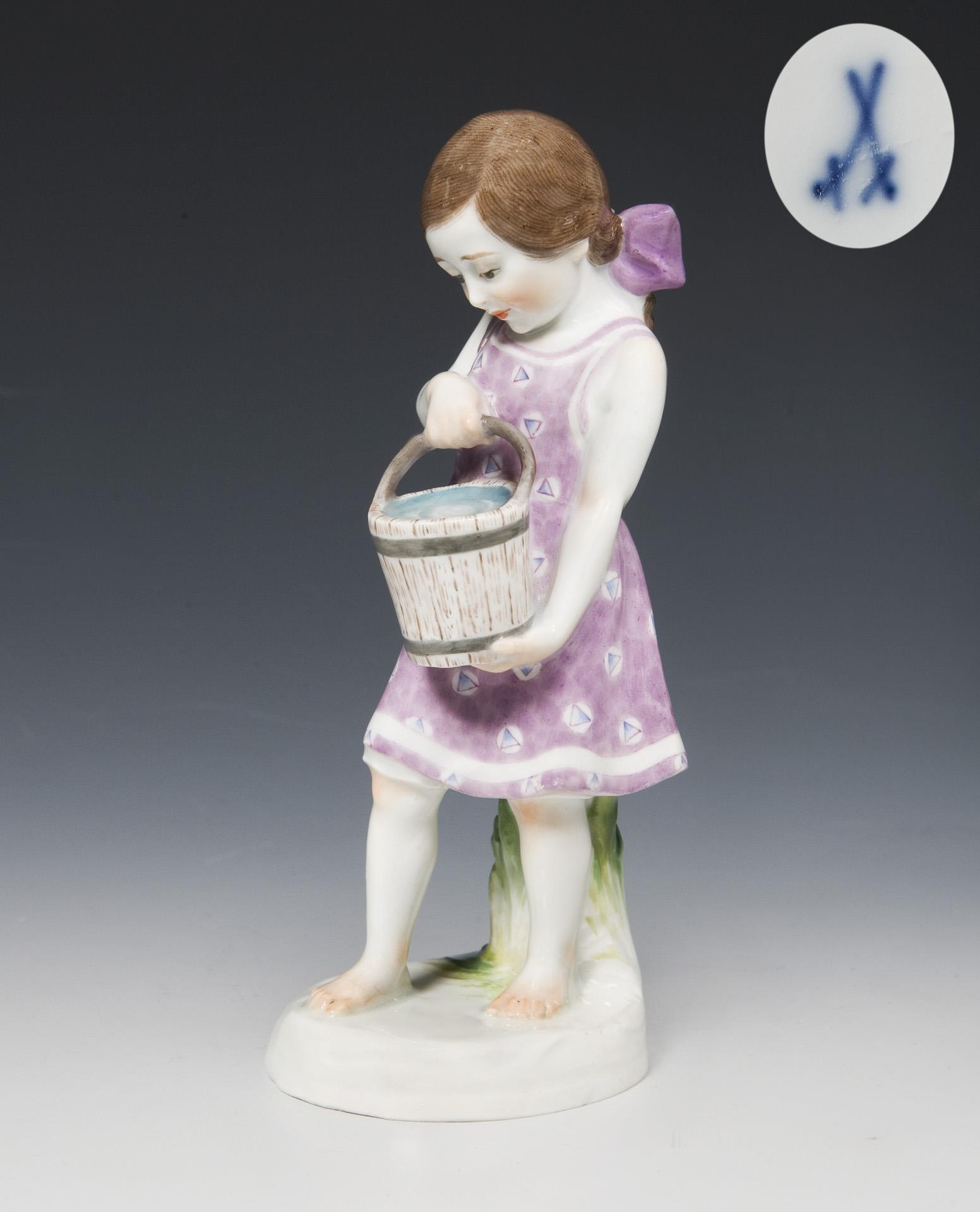 Counterpart to model no. E 231 "Boy with landing net on the beach", painted in color. Incised mark, impressed mark, painter's mark, sword mark, artist's signet. Feet, base restored.