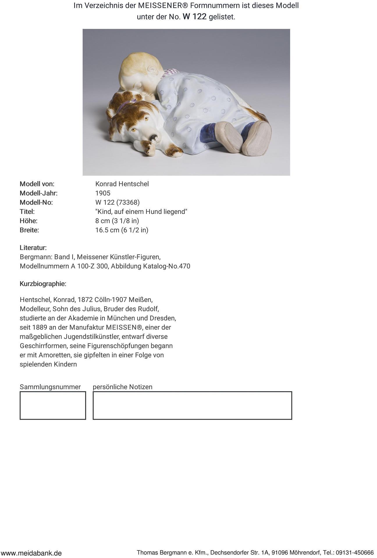 * Hentschel, Konrad: modeller, son of Julius, brother of Rudolf, studied at the academies in Munich and Dresden. From 1889 at the Meissen manufactory. One of Meissen's leading Art Nouveau artists, designed various tableware shapes and figurines * Meissen manufactory price: 9990 euros.