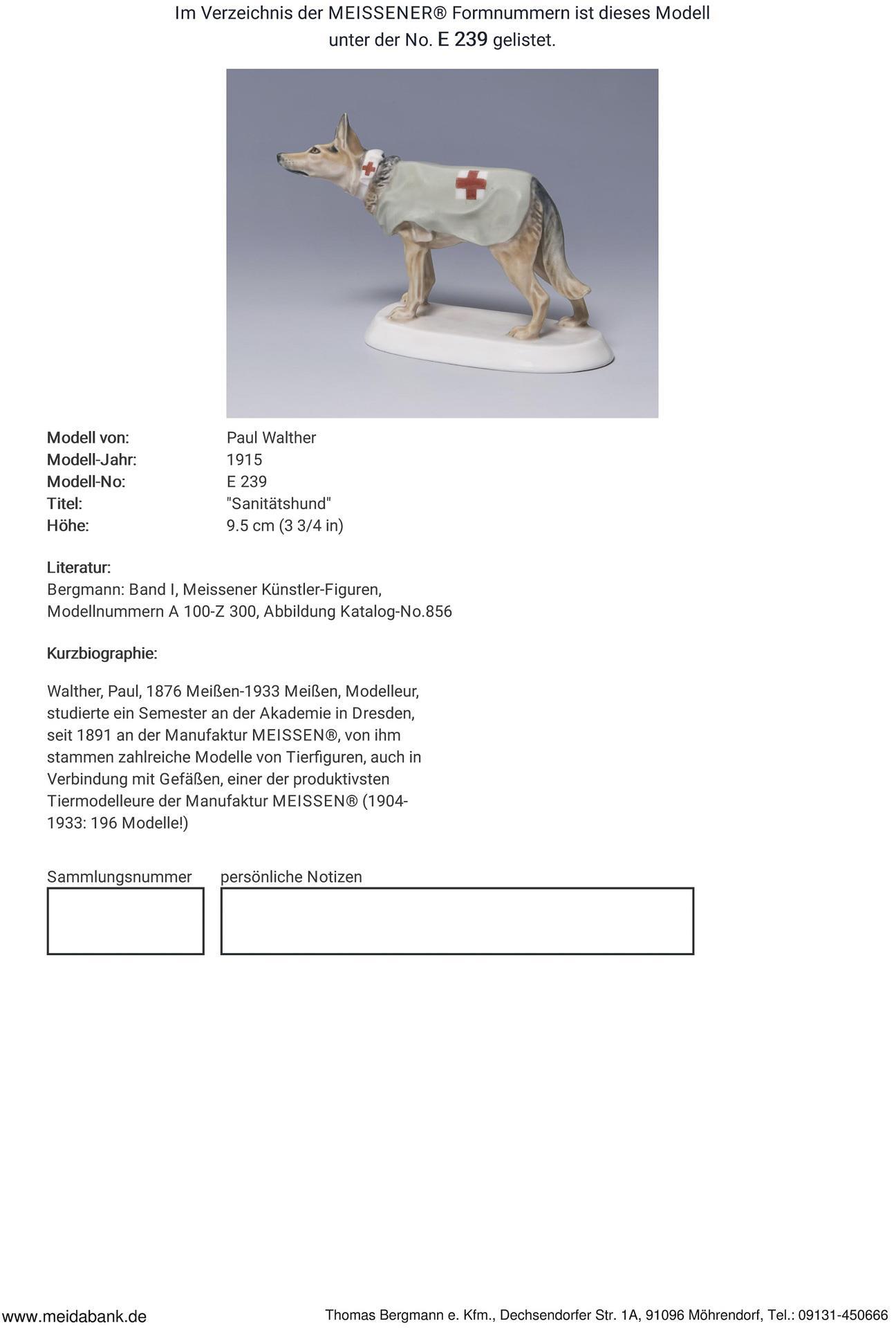 * Walther, modeller, studied one semester at the academy in Dresden. From 1895 at the Meissen manufactory, he produced numerous models of animal figures, also in connection with vessels, one of the most productive animal modelers at the manufactory.