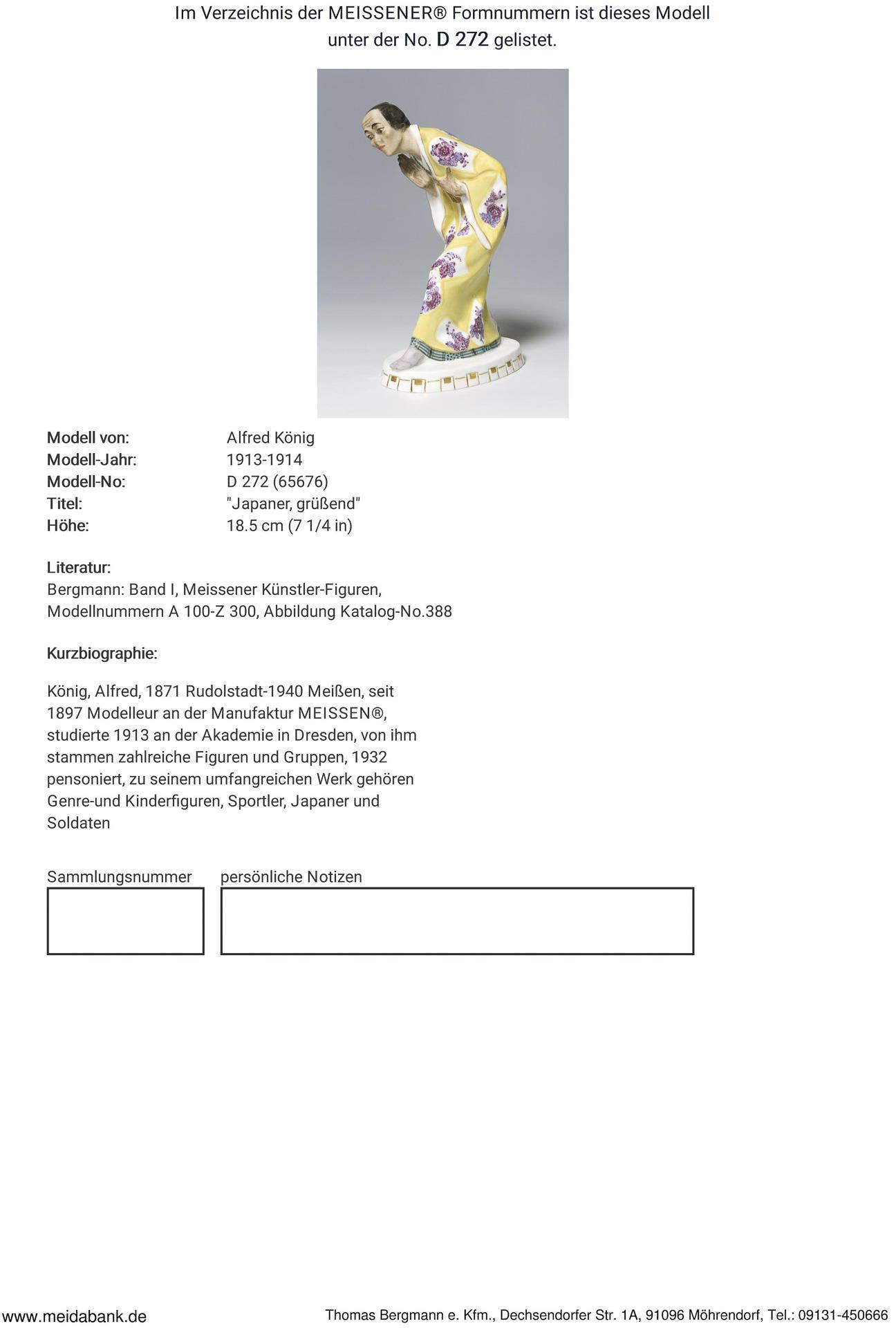 * König, modeller, porcelain maker in Thuringia. In 1896, the Meissen manufactory purchased eight figurine models from him. 1897-1932 modeller at the Meissen manufactory. He produced numerous figurines and groups * Meissen manufactory price: 8990 euros.