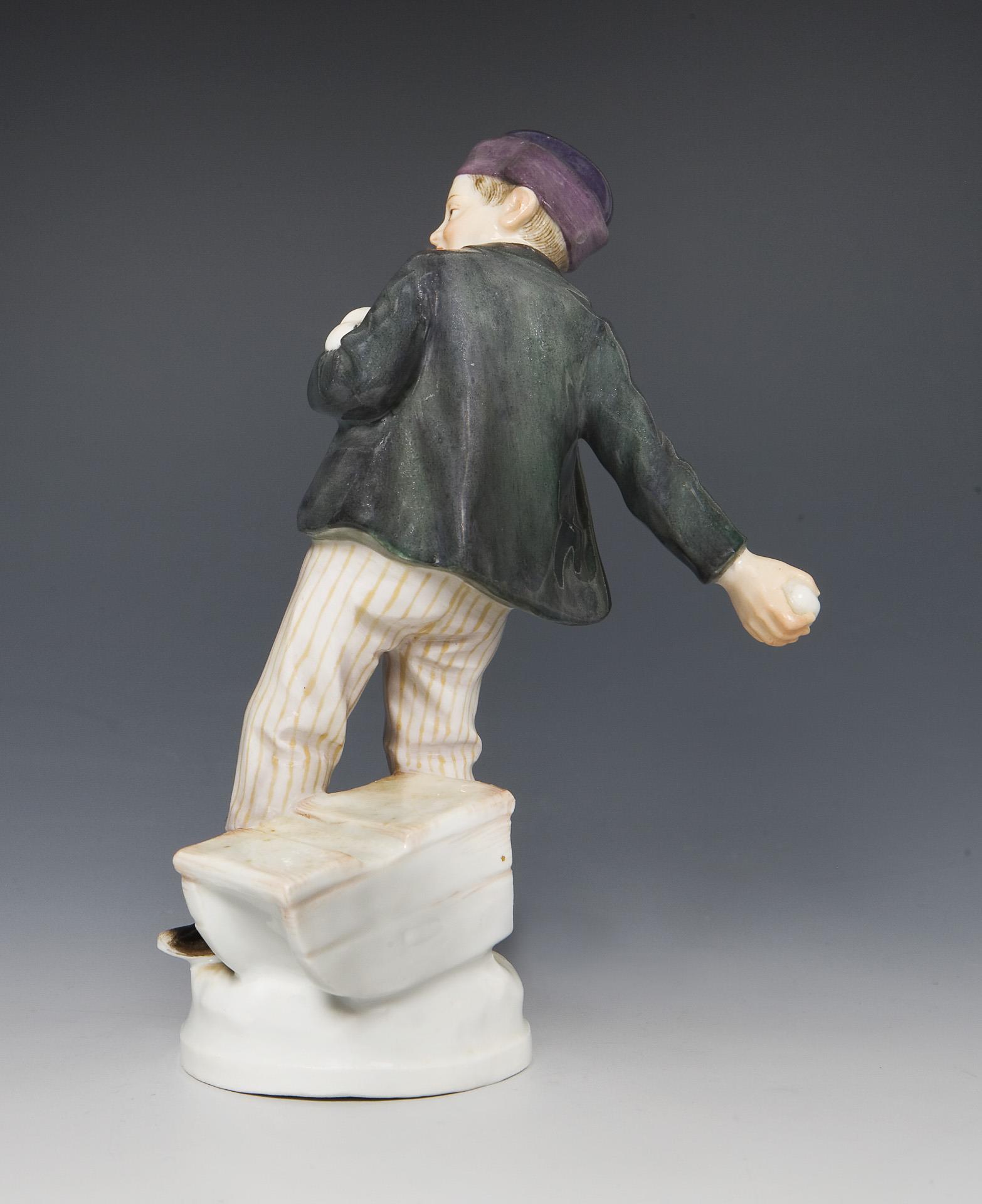 Art Nouveau children's figurine: boy throwing snowballs. Meissen.