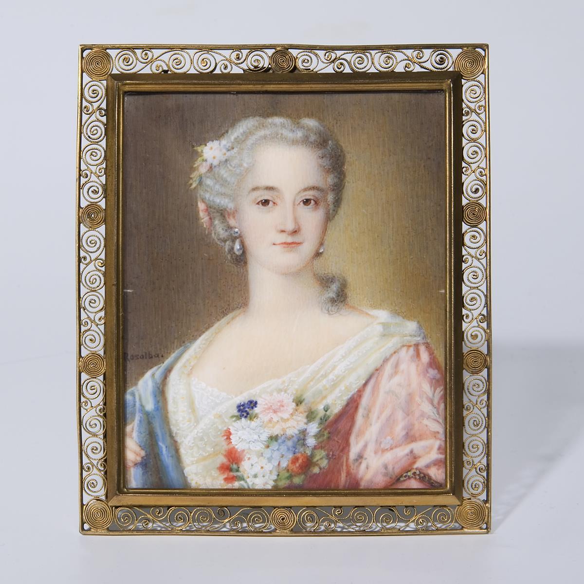 Sehr fein gemaltes Porträt einer adligen jungen Dame nach Rosalba Carierra (1675 Venedig - 1757 Venedig). Bezeichnet. Beidseits verglaster, filigran gearbeiteter Messingrahmen mit Öse und klappbarem Ständer, 11 x 9,5 cm.