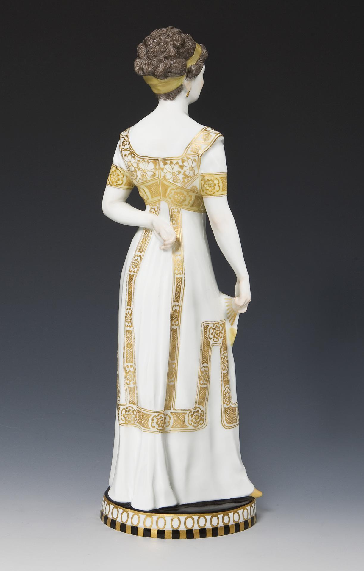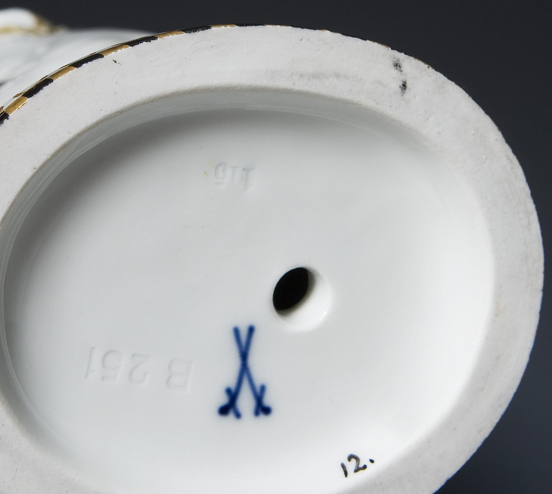 Painted in color and gold, base with ornamental decoration in black and gold. Press marks, painter's mark, sword mark. Barely recognizable minimal chips to the plinth rim on the reverse.