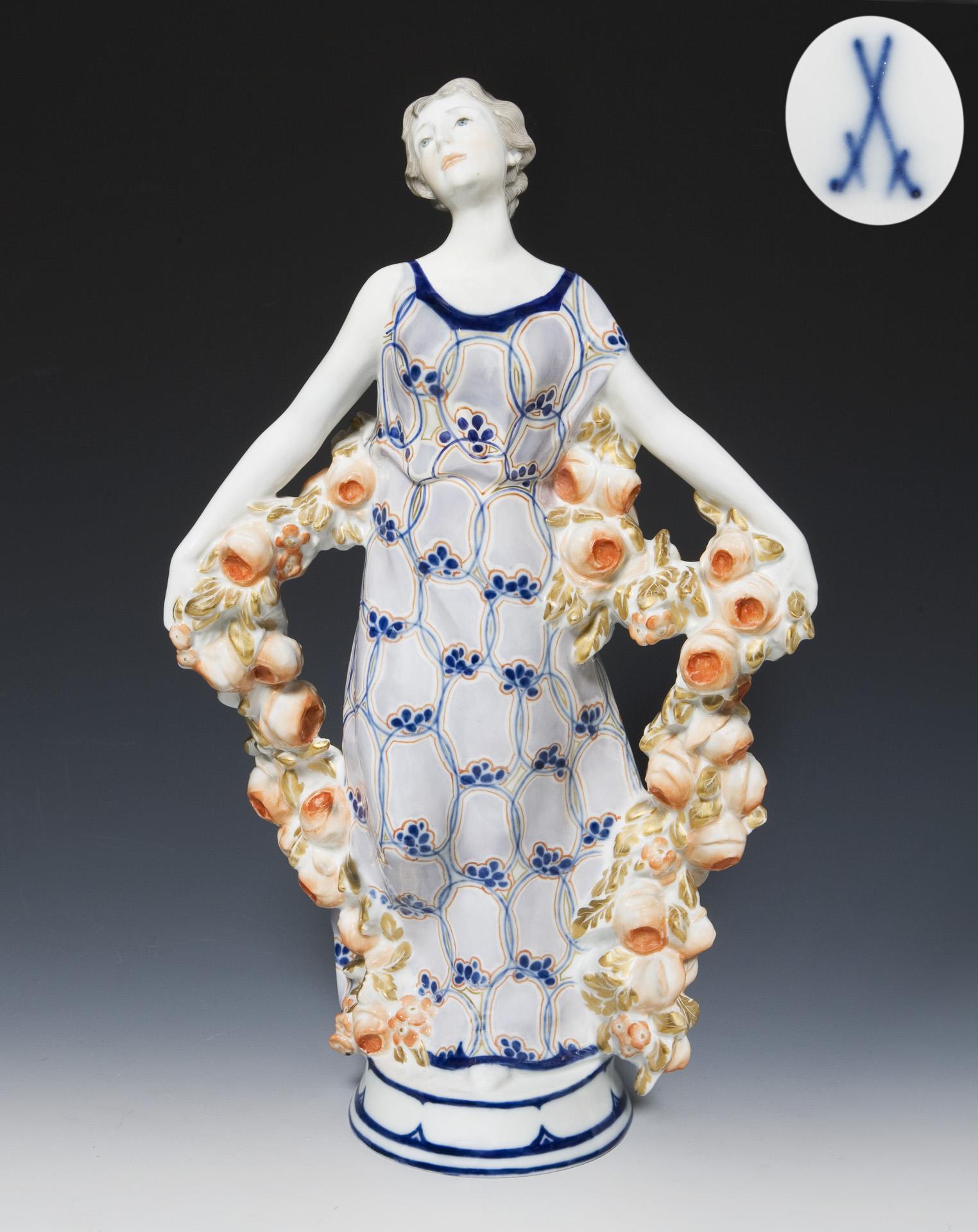 Rare large Art Nouveau figurine: Girl with rose garland. Meissen.