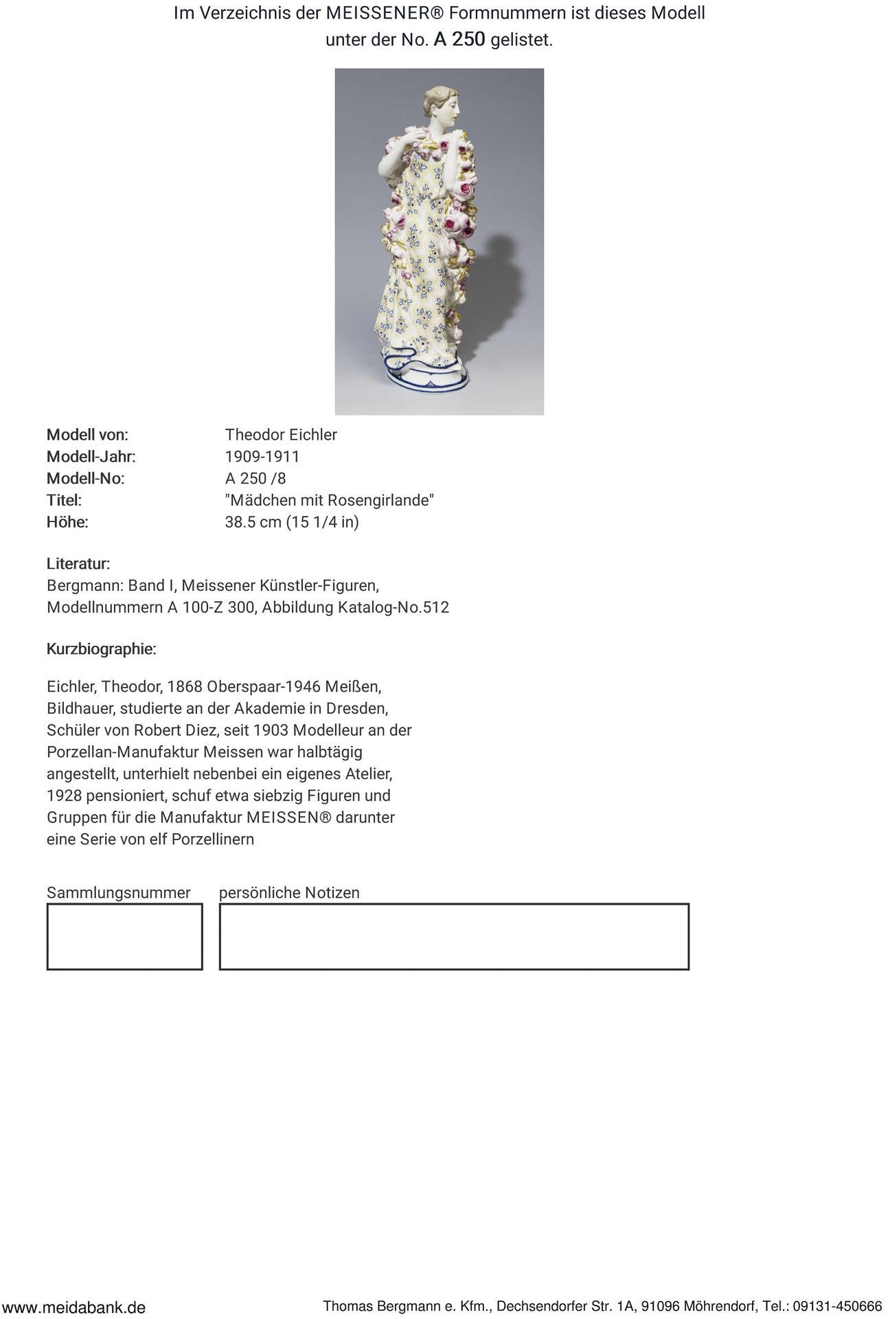 * Eichler, sculptor, porcelain modeller, studied at the Dresden School of Arts and Crafts and Academy. From 1886 at the Meissen porcelain manufactory, ran his own studio on the side, retired in 1928. Regularly represented at German art exhibitions from 1899, received various awards * Meissen manufactory price: 5490 euros.