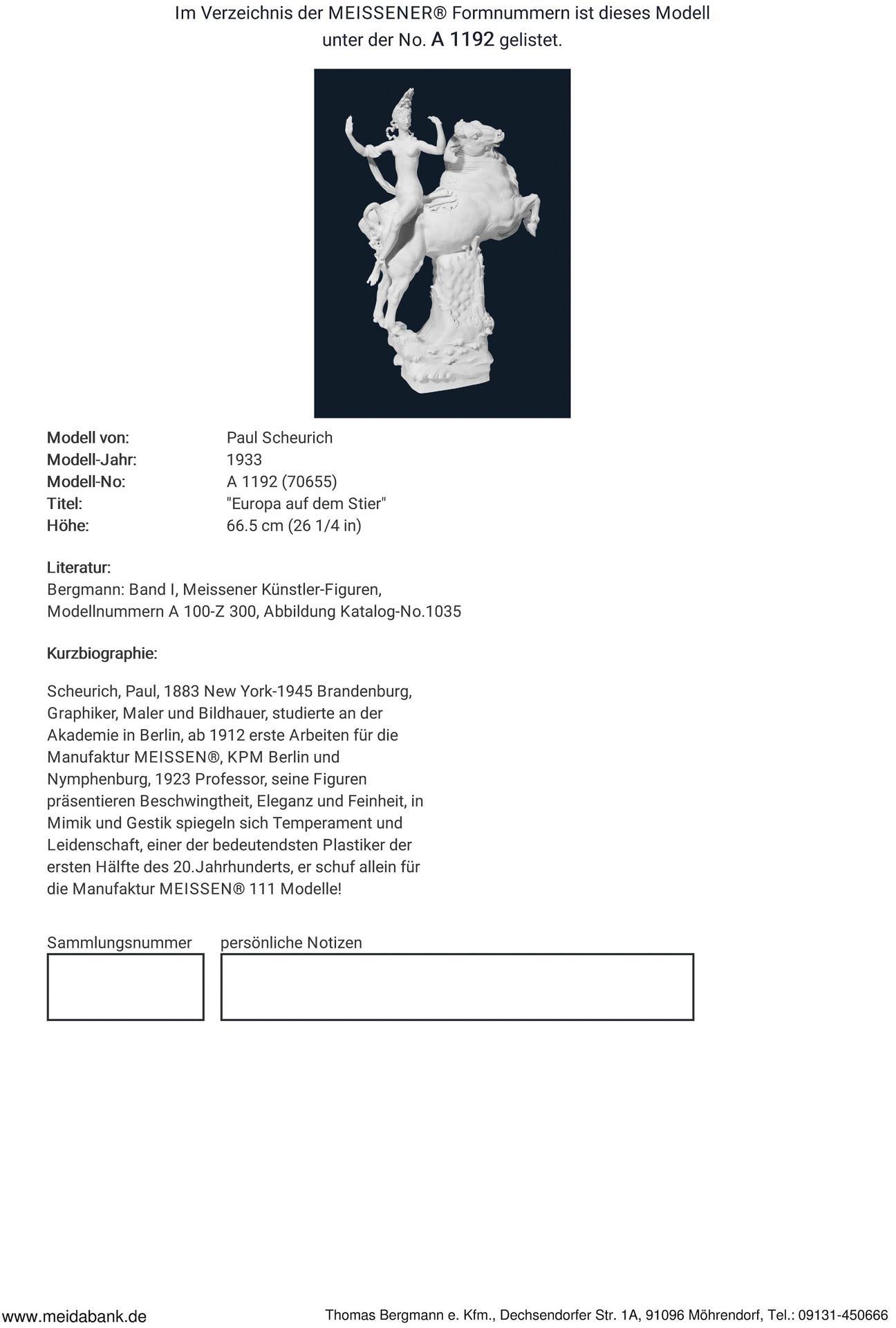 * Scheurich, painter, graphic artist, illustrator, sculptor, modeller, studied at the academy in Berlin. From 1912 first works for the Meissen manufactory, KPM Berlin and Nymphenburg. Titular professor in 1924, his figures present exuberance and elegance, his facial expressions and gestures reflect temperament and passion, one of the most important porcelain sculptors of his time * Meissen manufactory price: 15,590 euros (unpainted, in white). All lots with a limit (starting price) of at least €1,500 are checked against the Art Loss Register database.