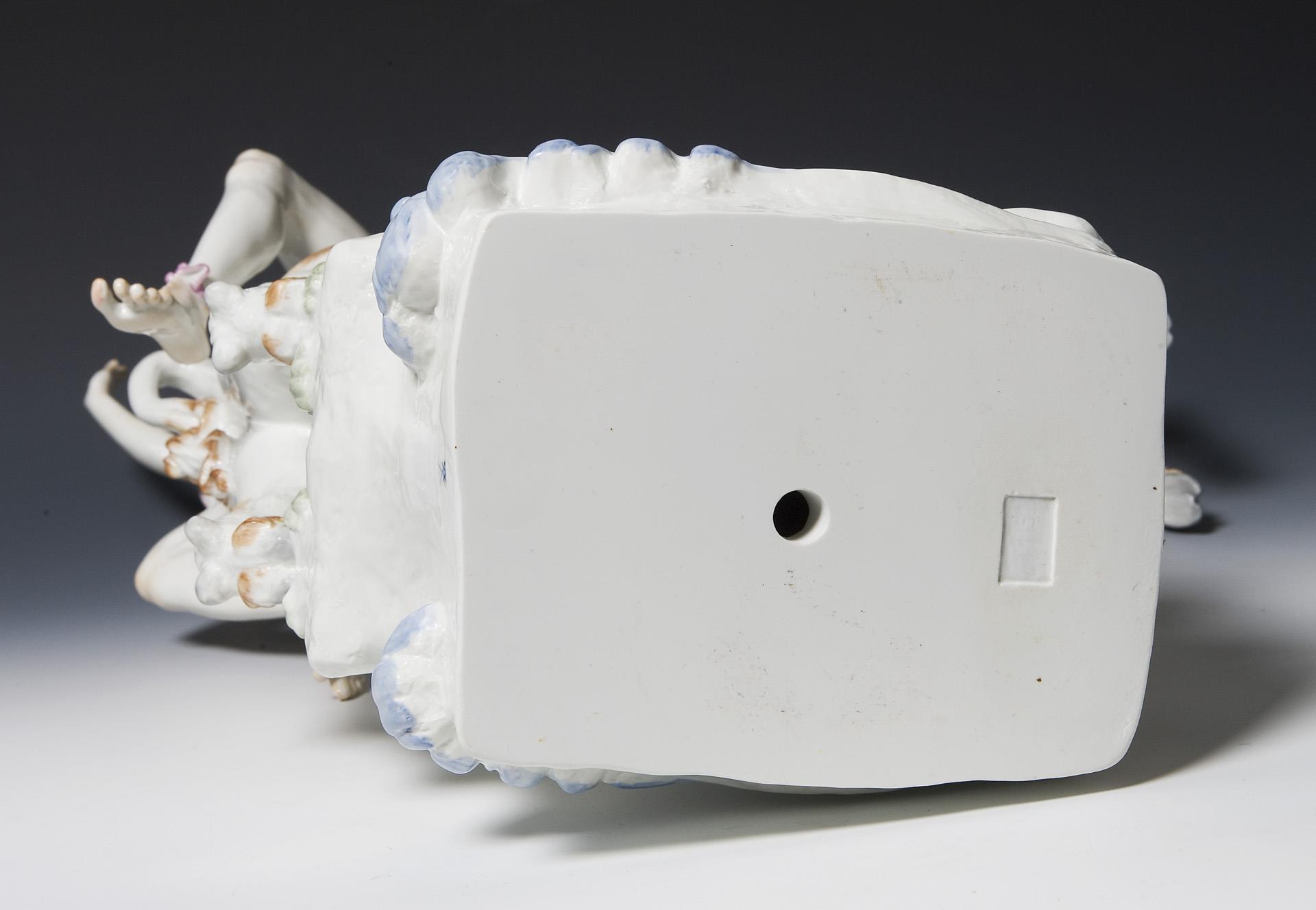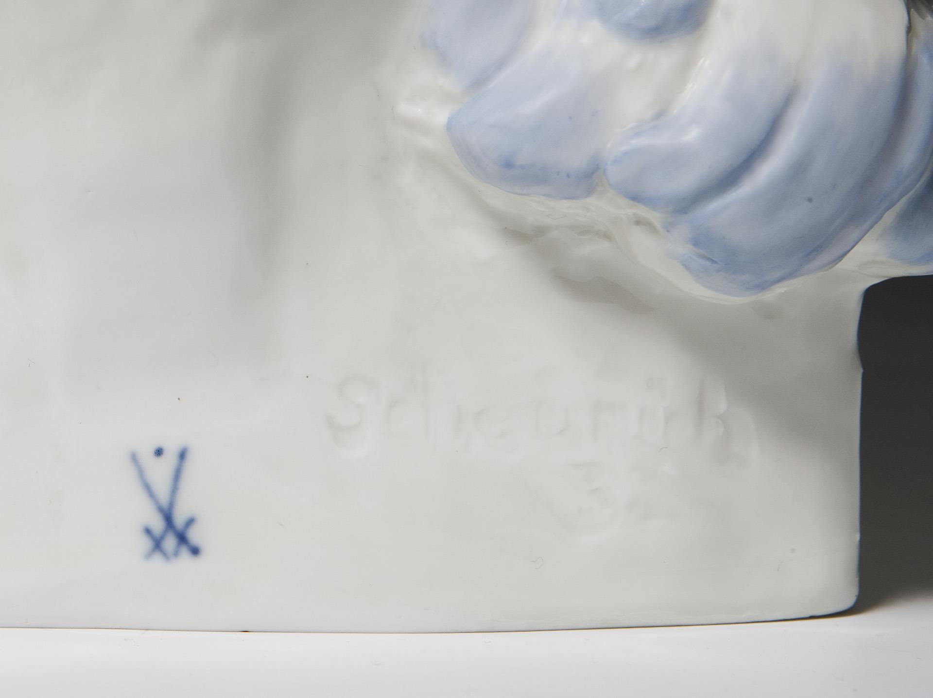 Painted in color, painted gold. THE MODEL WAS SENT TO THE MANUFACTORY BY SCHEURICH IN 1932; BUT NOT MADE IN PORCELAIN UNTIL 1933 OR 1934; THE FIRST SALE OF THE GROUP WAS BOOKED IN 1934; BY 1940 ONLY A TOTAL OF 3 EXEMPLARIES HAD COME ON THE MARKET (Meissener Manuskripte VIII, Johannes Rafael (1996) page 98). Unglazed base, incised mark, sword mark with dot on the base, artist's signet. Fine glaze crack to the front of the base.