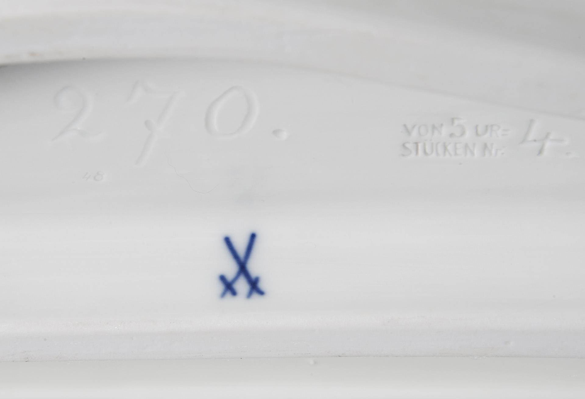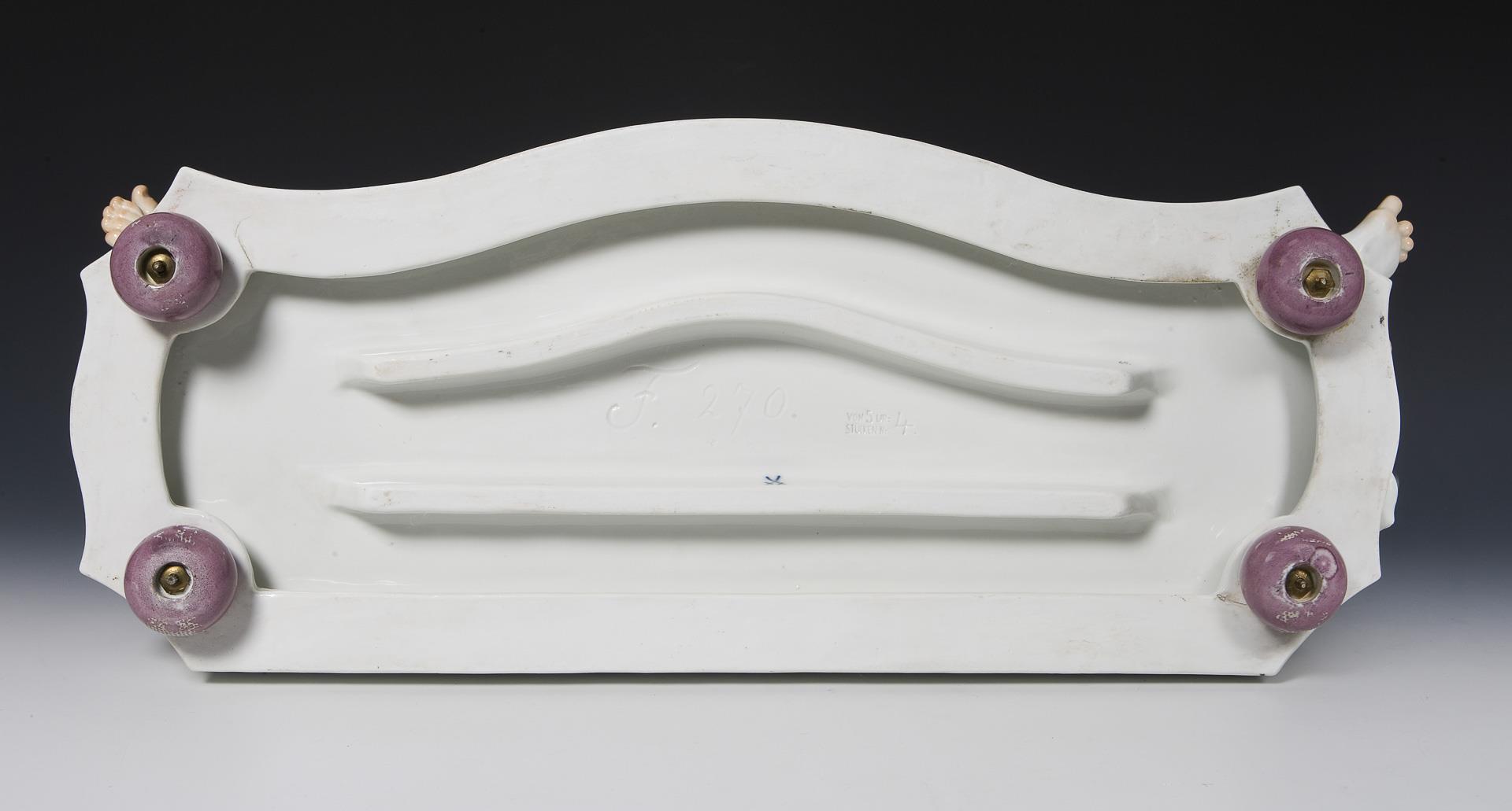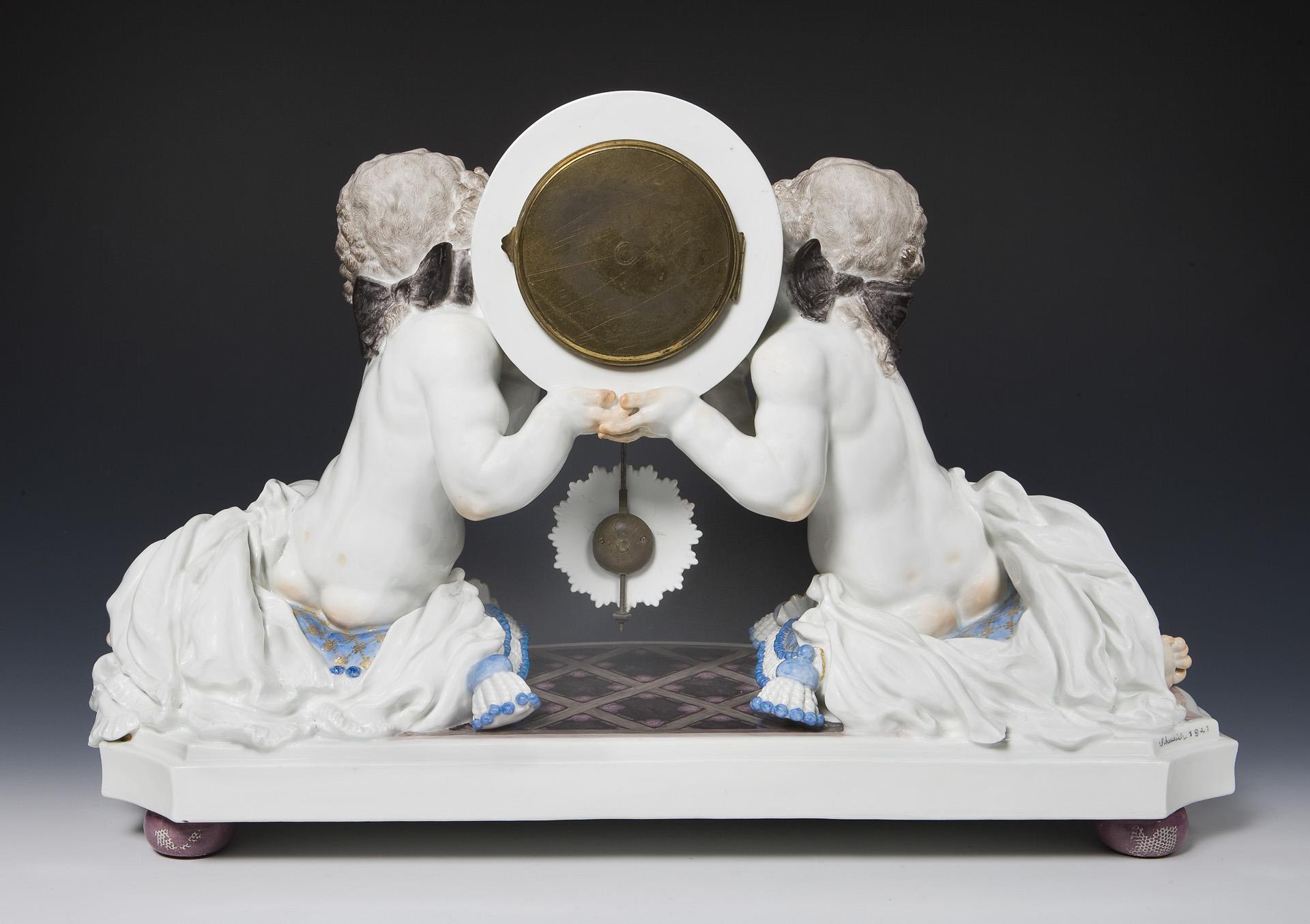 Painted in color, painted gold. Original porcelain dial with Arabic numerals in relief, original porcelain pendulum bob. Lenzkirch movement with striking mechanism on bell, key winding. Mounted ball feet. Incised mark, press mark, painter's mark, sword mark, press mark: Of 5 original pieces no. 4, handwritten artist's signet, dated: 1921.THE FIRST EXEMPLAR WAS SOLD IN SEPTEMBER 1921 FOR 3824,- MARK. The production of masterpieces (artist's proofs) was introduced in 1918. The shaping and painting of these pieces was supervised or reworked by the artist himself. Therefore, masterpieces are usually signed by the artist himself in overglaze paint. Firing cracks testify to the technical difficulties in the production of original pieces. Partially small firing cracks, two tassels on the front, base slightly chipped, hands replaced, movement functional in the short-term test.