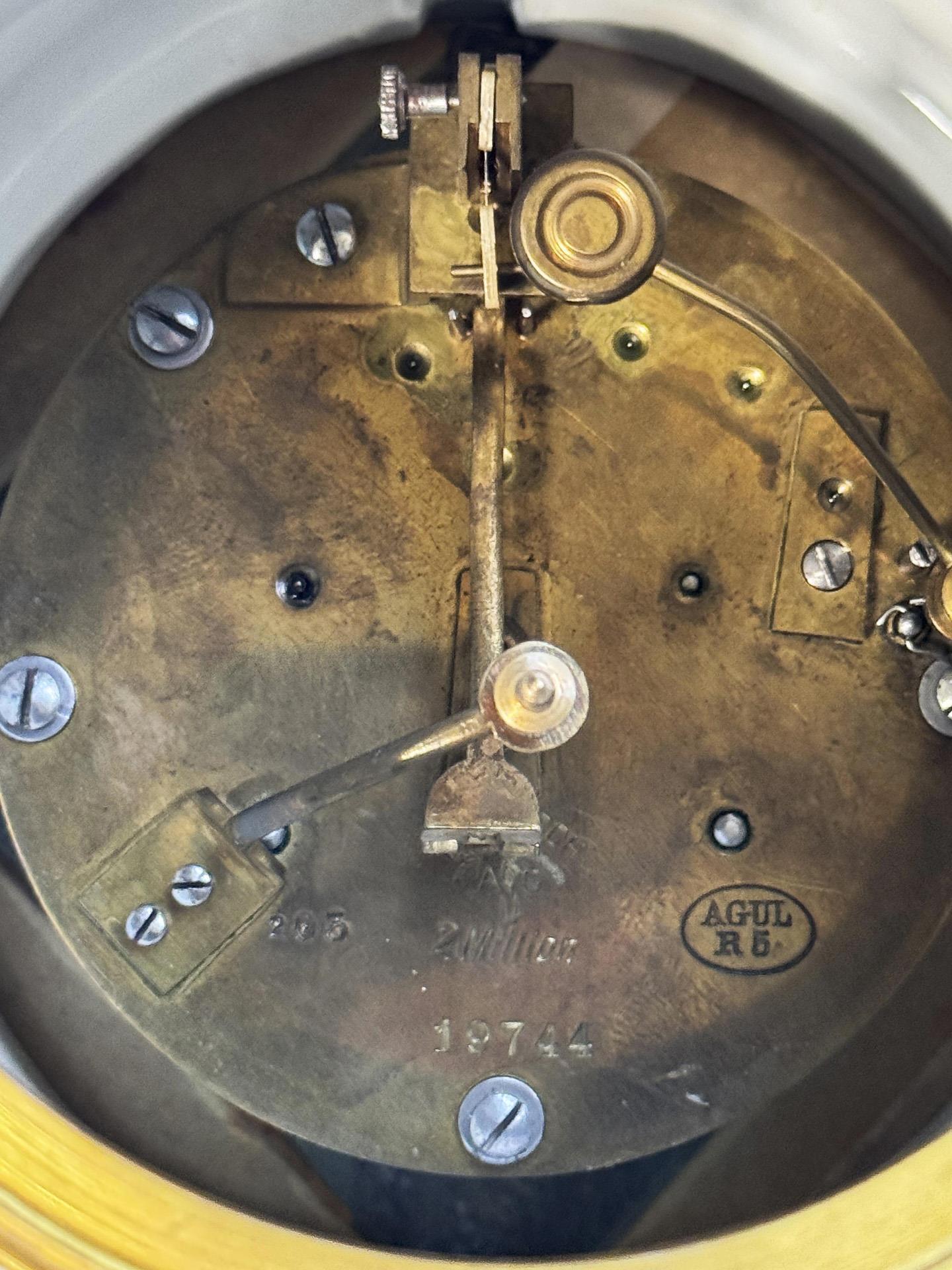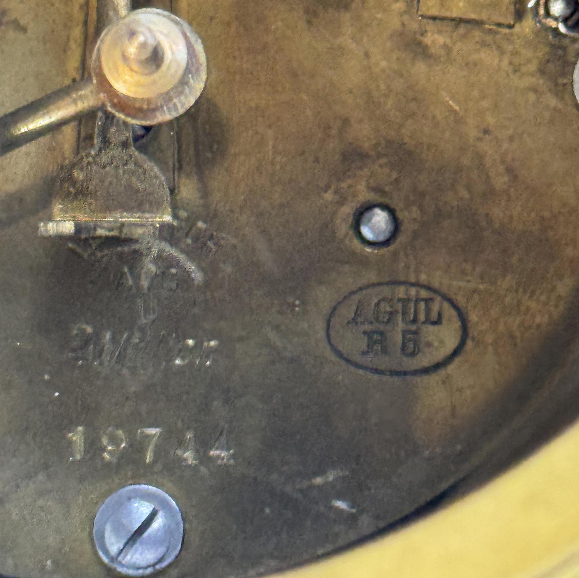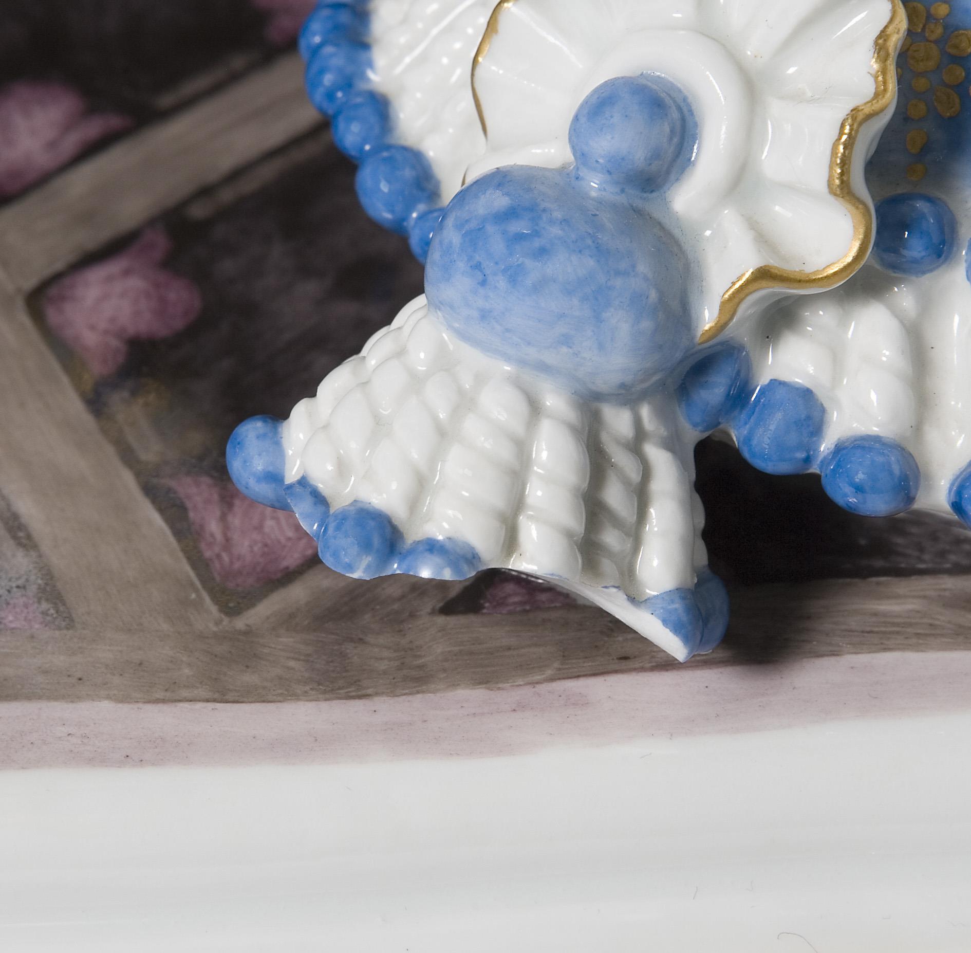 Painted in color, painted gold. Original porcelain dial with Arabic numerals in relief, original porcelain pendulum bob. Lenzkirch movement with striking mechanism on bell, key winding. Mounted ball feet. Incised mark, press mark, painter's mark, sword mark, press mark: Of 5 original pieces no. 4, handwritten artist's signet, dated: 1921.THE FIRST EXEMPLAR WAS SOLD IN SEPTEMBER 1921 FOR 3824,- MARK. The production of masterpieces (artist's proofs) was introduced in 1918. The shaping and painting of these pieces was supervised or reworked by the artist himself. Therefore, masterpieces are usually signed by the artist himself in overglaze paint. Firing cracks testify to the technical difficulties in the production of original pieces. Partially small firing cracks, two tassels on the front, base slightly chipped, hands replaced, movement functional in the short-term test.
