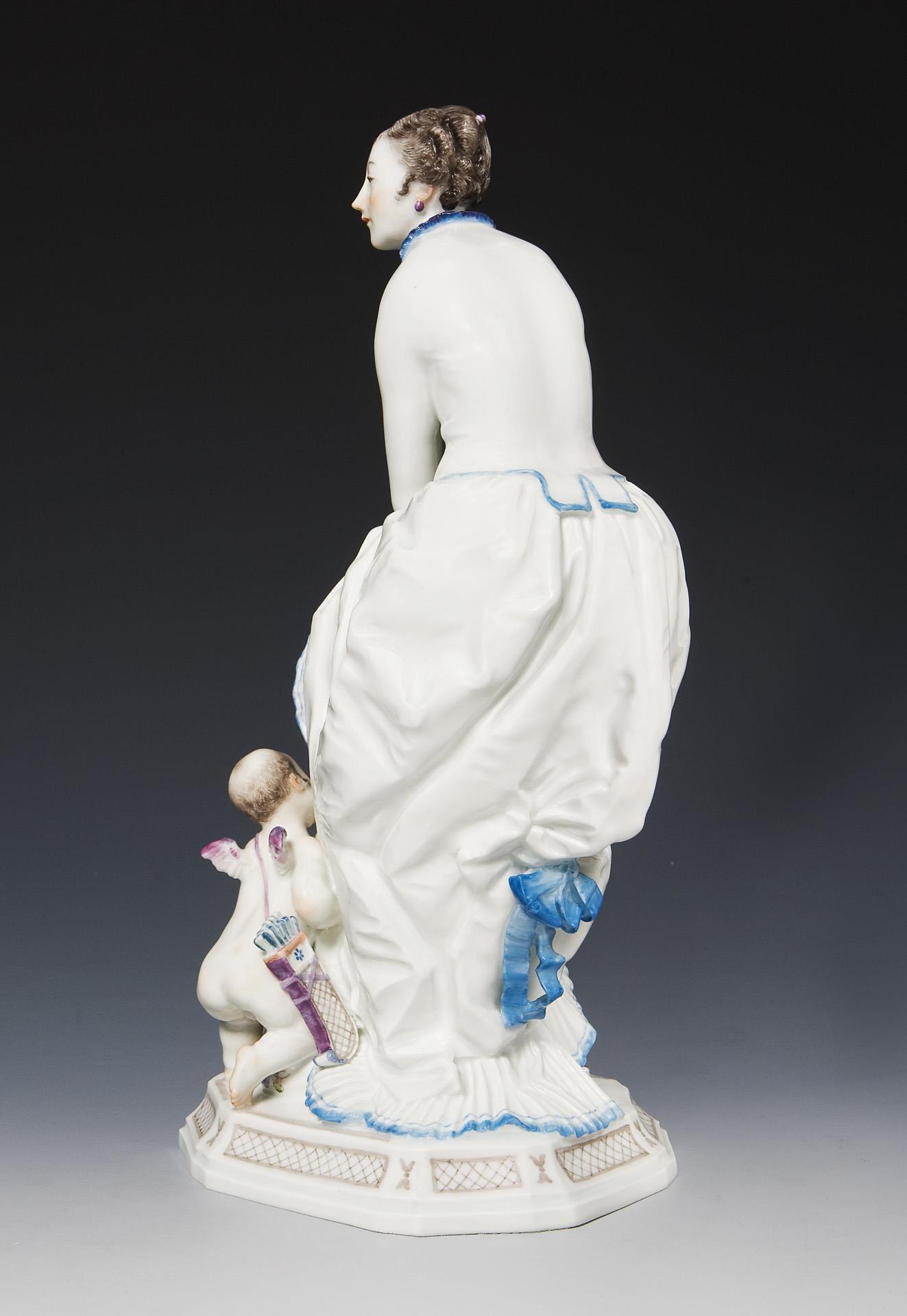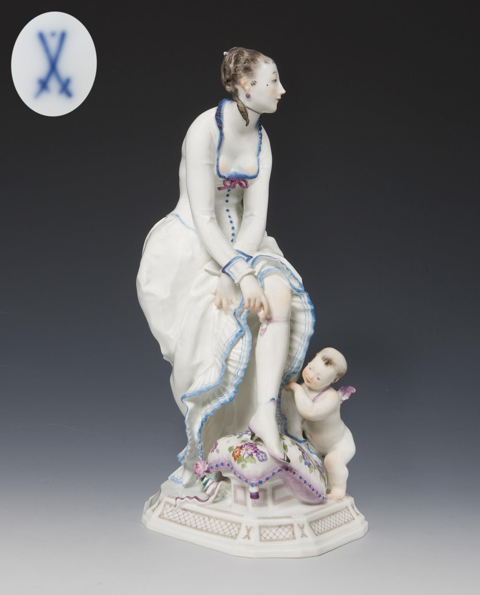 Art deco figurine: Lady with garter and cupid. Meissen.