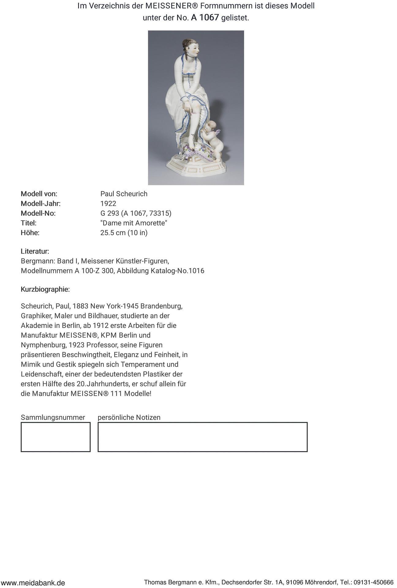 * Scheurich, painter, graphic artist, illustrator, sculptor, modeller, studied at the academy in Berlin. From 1912 first works for the Meissen manufactory, KPM Berlin and Nymphenburg. Titular professor in 1924, his figures present exuberance and elegance, his facial expressions and gestures reflect temperament and passion, one of the most important porcelain sculptors of his time * Meissen manufactory price: 12,000 euros.
