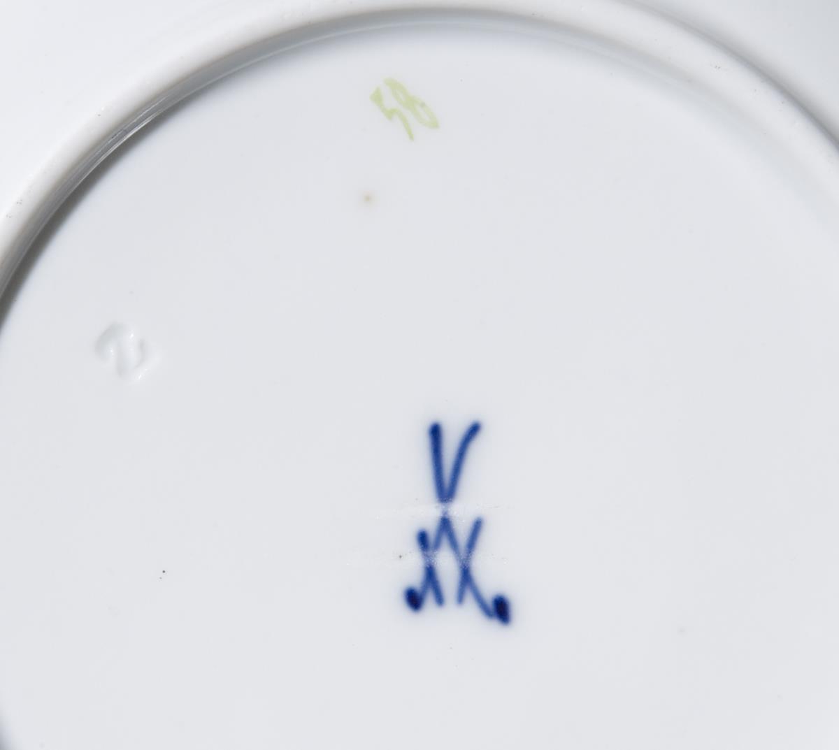 Biedermeier-Form "Schwanenhenkel". 22 Teile: 1 Kaffeekanne, 1 Kannen-Untersetzer, 1 Milchkännchen, 1 Zuckerdose, 12er Satz Tassen, 12er Satz Untertassen, 12er Satz kleine Dessertteller. Farbige Blumenbemalung. Pressmarken, Malermarken, Schwertermarken meist zweimal oder dreimal gestrichen.