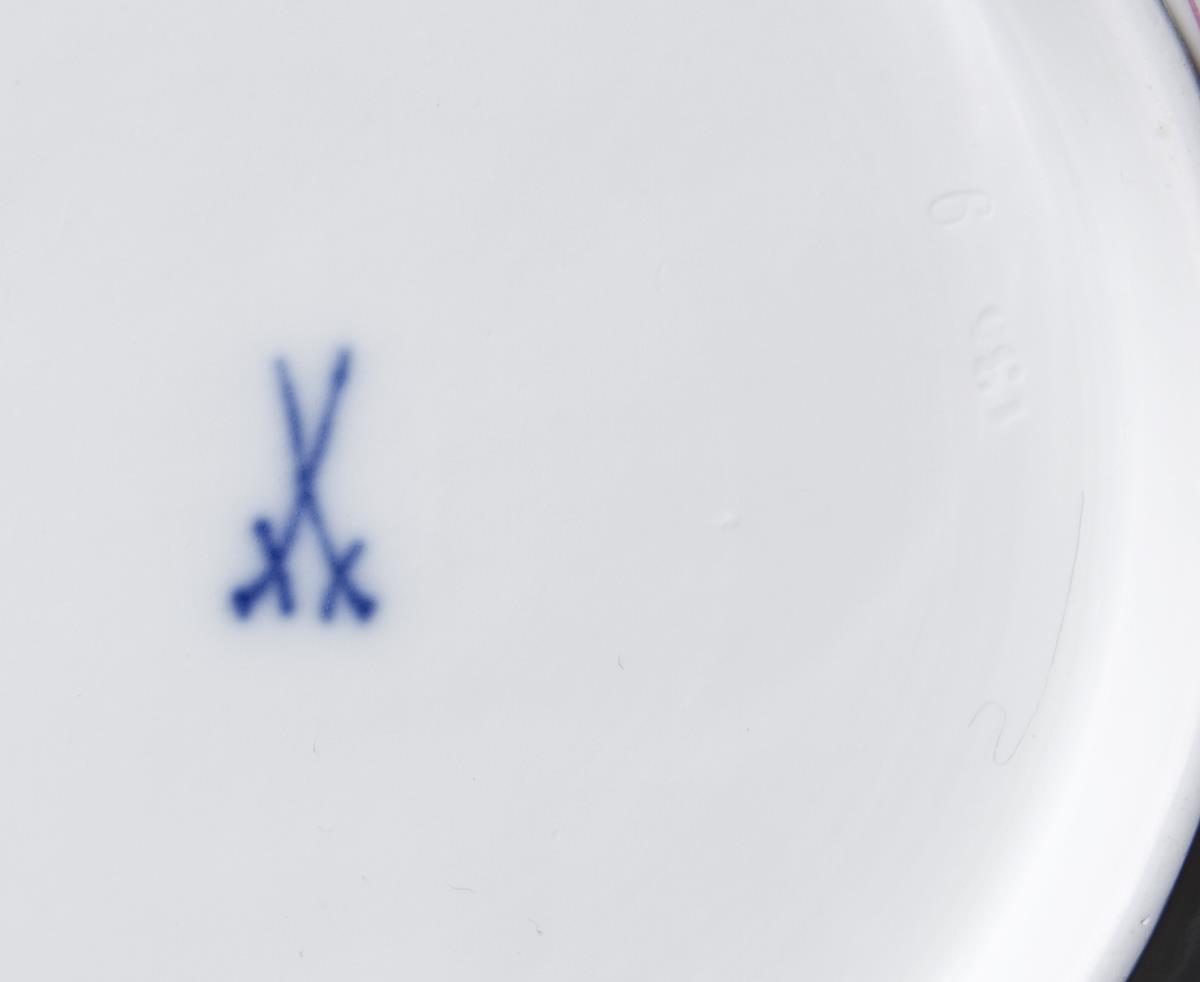 Form "Neuer Ausschnitt". 16 Teile: 1 große Platte, 1 quadratische Schale, 1 runde Schale, 1 Sauciere, 6er Satz Essteller, 6er Satz Suppenteller. Purpur-Camaieumalerei mit Goldpunkten, gold staffiert. Pressmarken, Schwertermarken 1. Wahl.