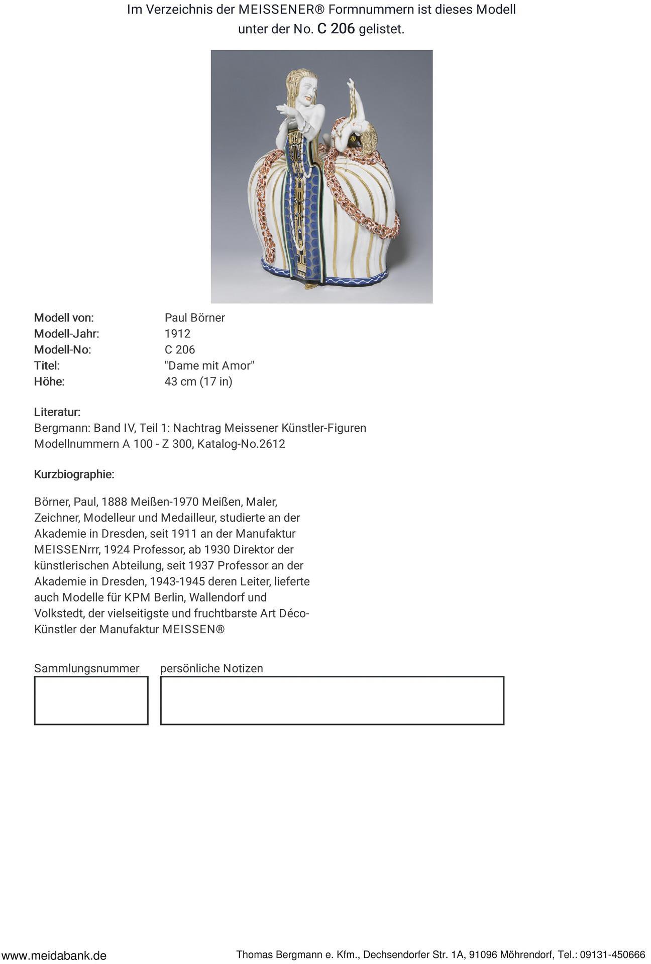 * Börner, painter, draughtsman, modeller and medallist, studied at the academy in Dresden. From 1911 at the Meissen manufactory, 1924 professor, from 1930 director of the art department, from 1937 professor at the academy in Dresden, 1943-1945 its director. Also produced models for KPM Berlin, Wallendorf and Volkstedt, the most versatile and prolific Art Deco artist at the Meissen manufactory. All lots with a limit (starting price) of at least €1,500 are checked against the Art Loss Register database.