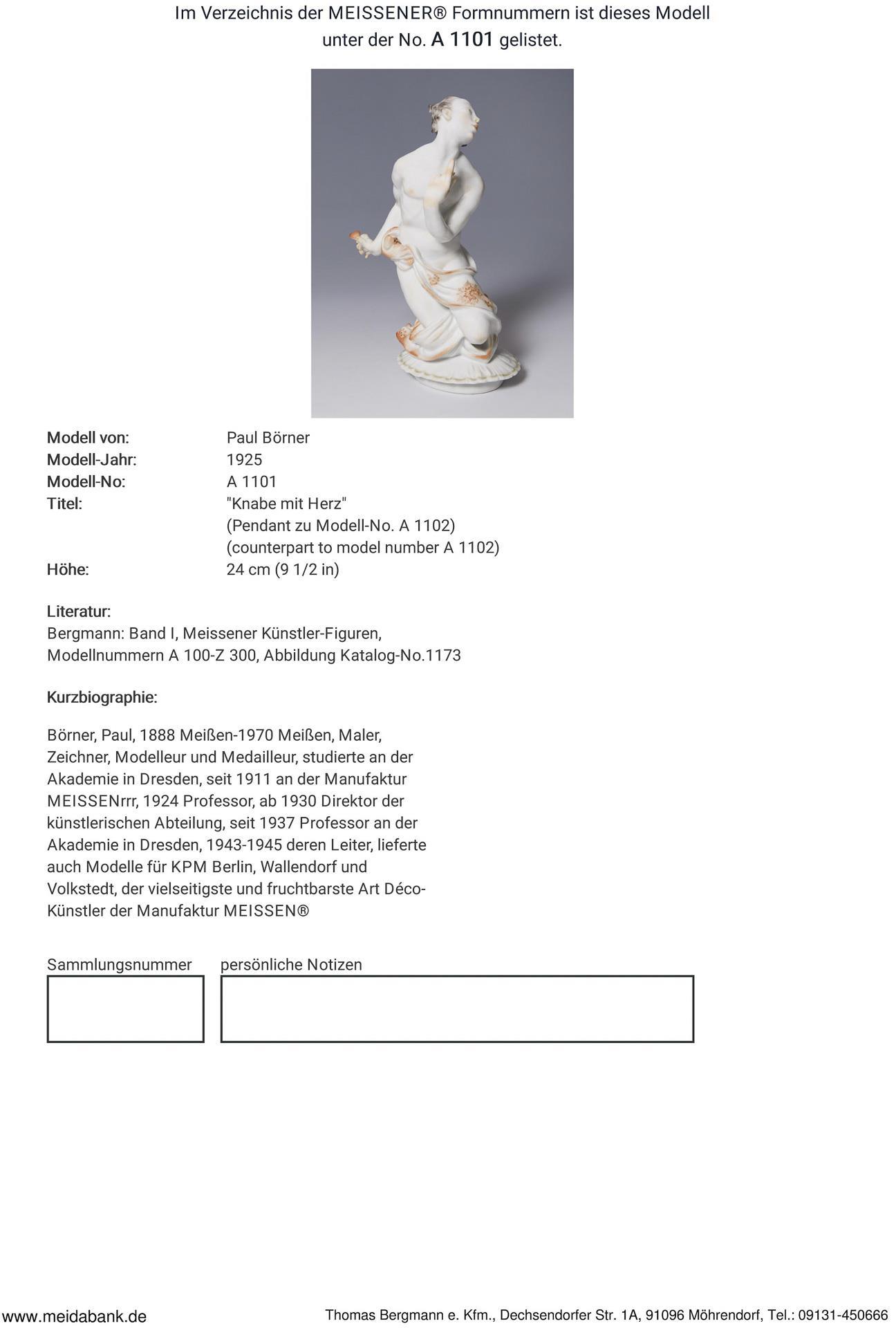 * Börner, painter, draughtsman, modeller and medallist, studied at the academy in Dresden. From 1911 at the Meissen manufactory, 1924 professor, from 1930 director of the art department, from 1937 professor at the academy in Dresden, 1943-1945 its director. Also supplied models for KPM Berlin, Wallendorf and Volkstedt, the most versatile and prolific Art Deco artist at the Meissen manufactory.