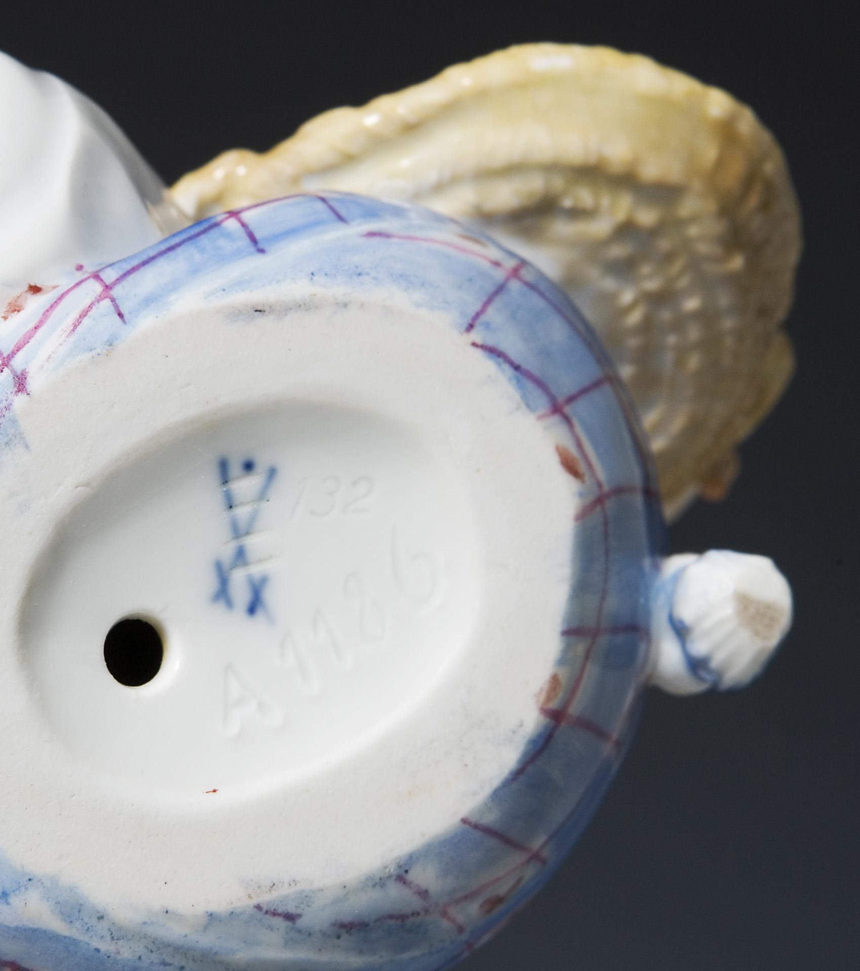 Painted in color. Incised mark, pressed mark, sword mark with dot painted four times. One shoe minimally chipped at the bottom.