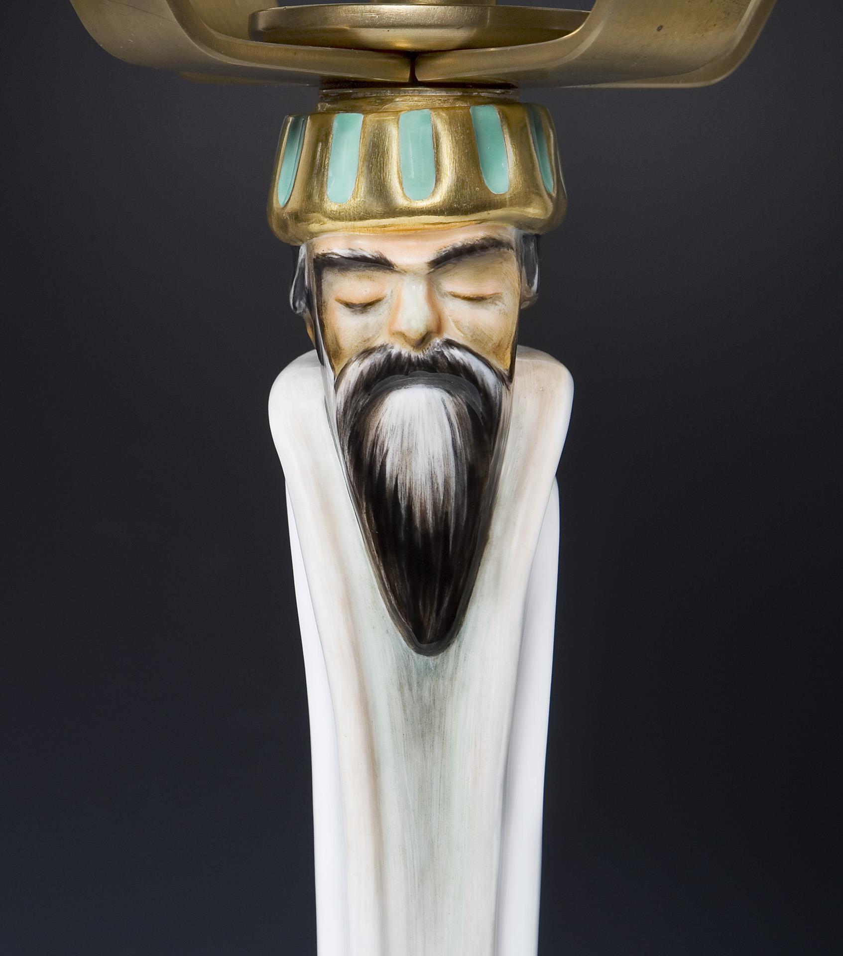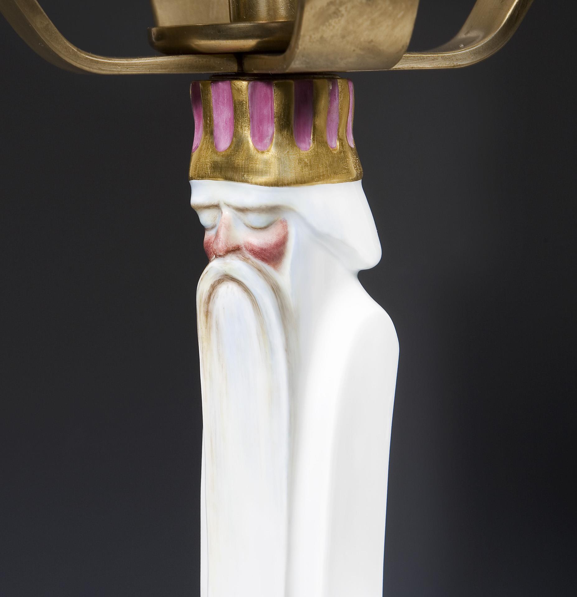 Also known as the Three Wise Men from the East. Caspar, Melchior and Balthasar are depicted as a young boy, an adult man and an old man. Painted in color, gold painted, 5-flame brass mount. Incised marks, pressed marks, painter's marks, sword marks. One mount loose.