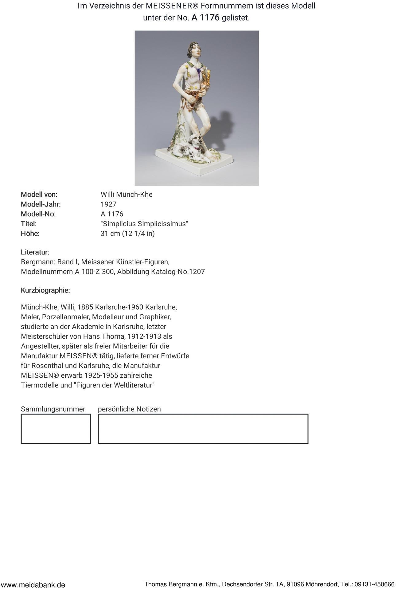 Painted in color. Figure from the 1668 picaresque novel by Hans Jakob Christoffel von Grimmelshausen. Incised mark, press mark, painter's mark, sword mark with dot on the base, artist's signet. One pipe restored, chipped.