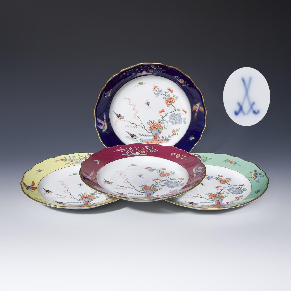 Form "Neuer Ausschnitt". Fahnen mit gelben und seegrünem Fond, Kobalt- und Purpurfond. Farbig bemalt, gold staffiert. Dekor "Indische Fels-, Blumen- und Vogelmalerei. Pressmarken, Schwertermarken 1. Wahl.