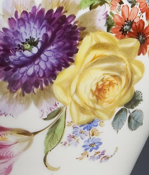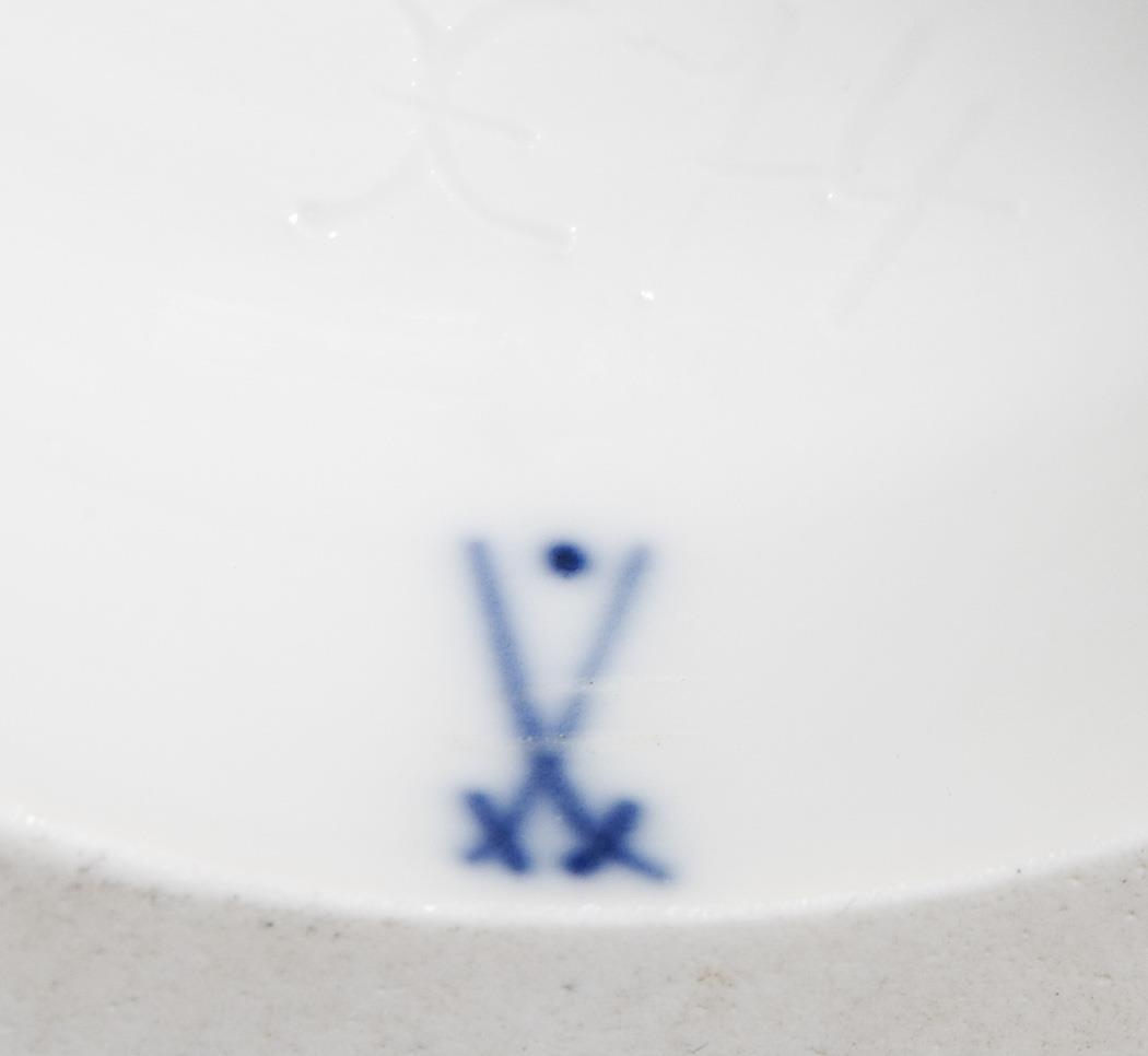 Mold model by Carl Gotthelf Habenicht and colleagues. Cobalt blue rims with golden "A-edge", colored flower painting on both sides, gold staffgae, mounted round base over square plinth. Incised mark, impressed mark, sword mark with dot crossed out twice.