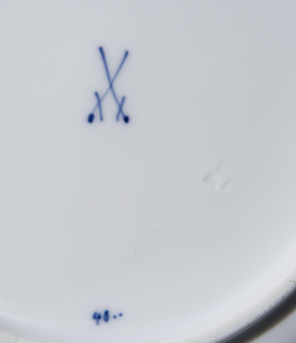 Form "Neuer Ausschnitt". Kobaltblaue Unterglasurmalerei, farbige Aufglasurmalerei. Goldstaffage, Goldränder. "Zwiebelmusterdekor". Pressmarken, Malermarken, Schwertermarken 1. Wahl.