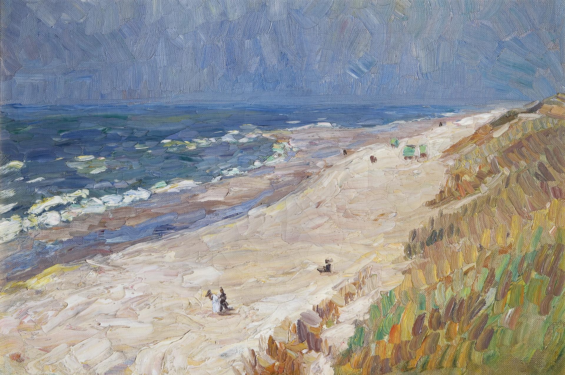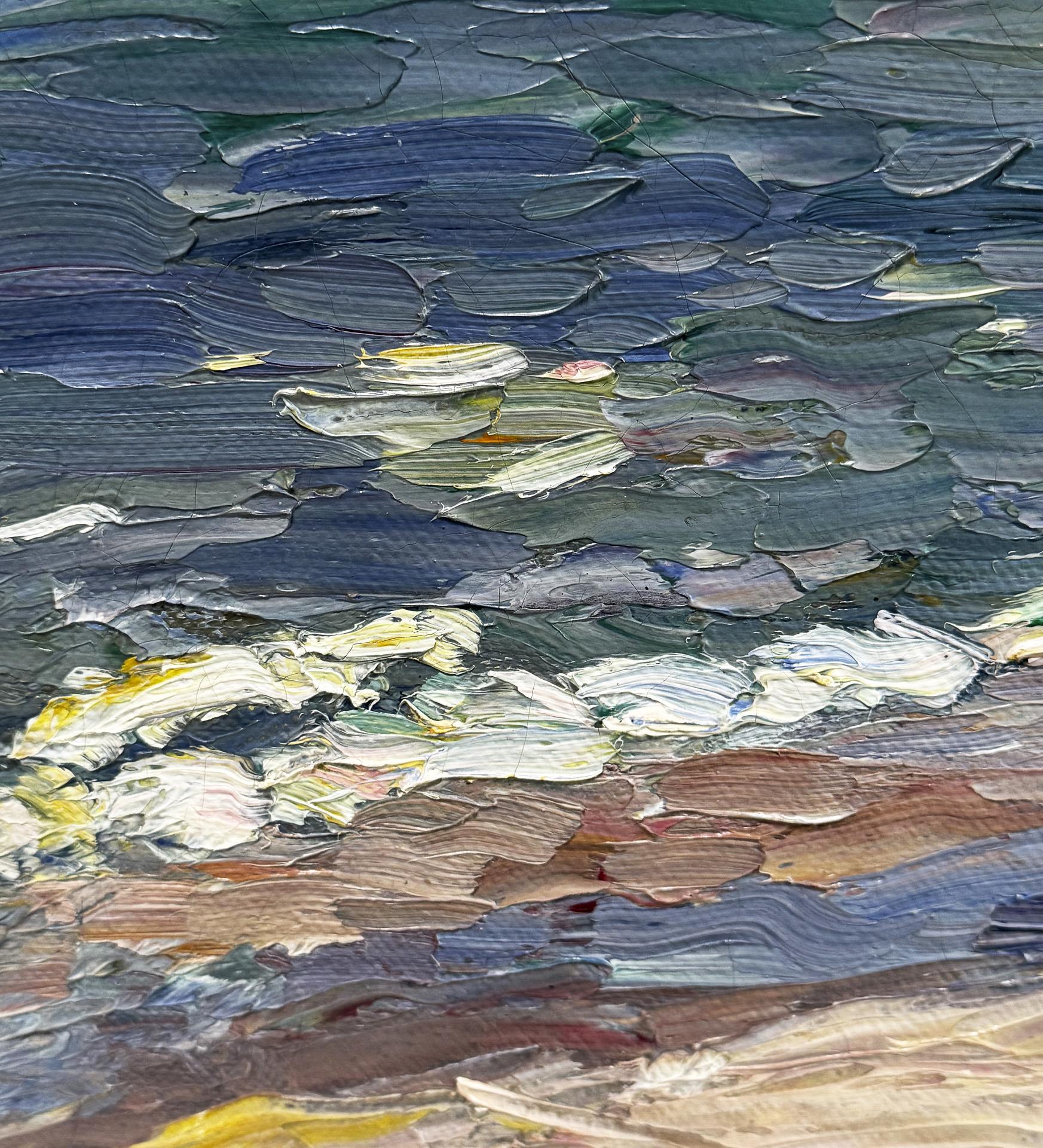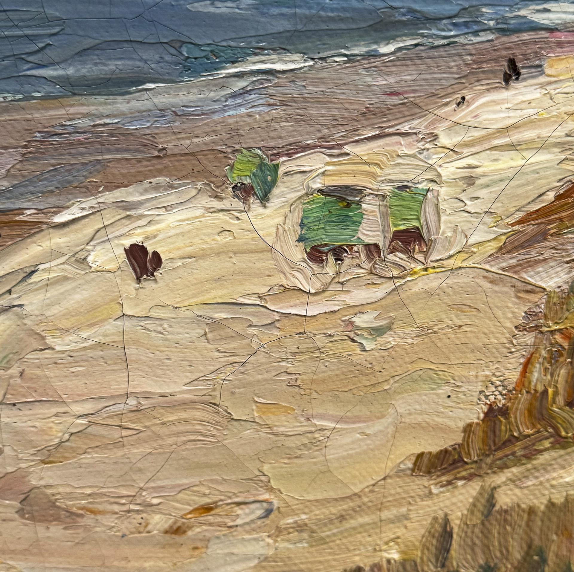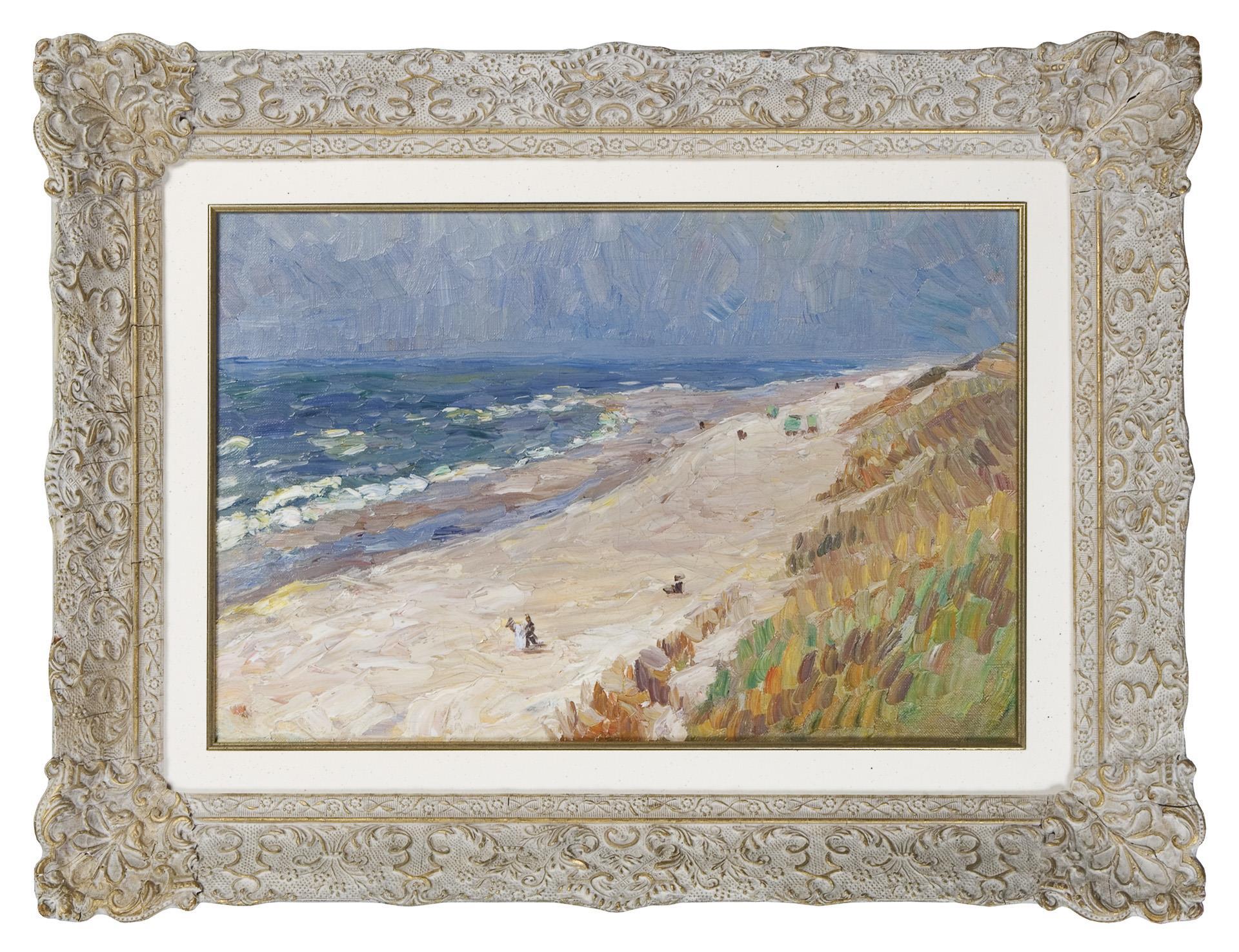 Of captivating virtuosity, with generous broad brushstrokes, impasto painted view with large areas and clear contrasting colors. The motif and painting style are reminiscent of the coastal landscapes of Wassily Kandinsky, which he created on his travels at the beginning of the century. Mint stretcher frame, mint stucco frame. Partially slight craquelure, relined edges.