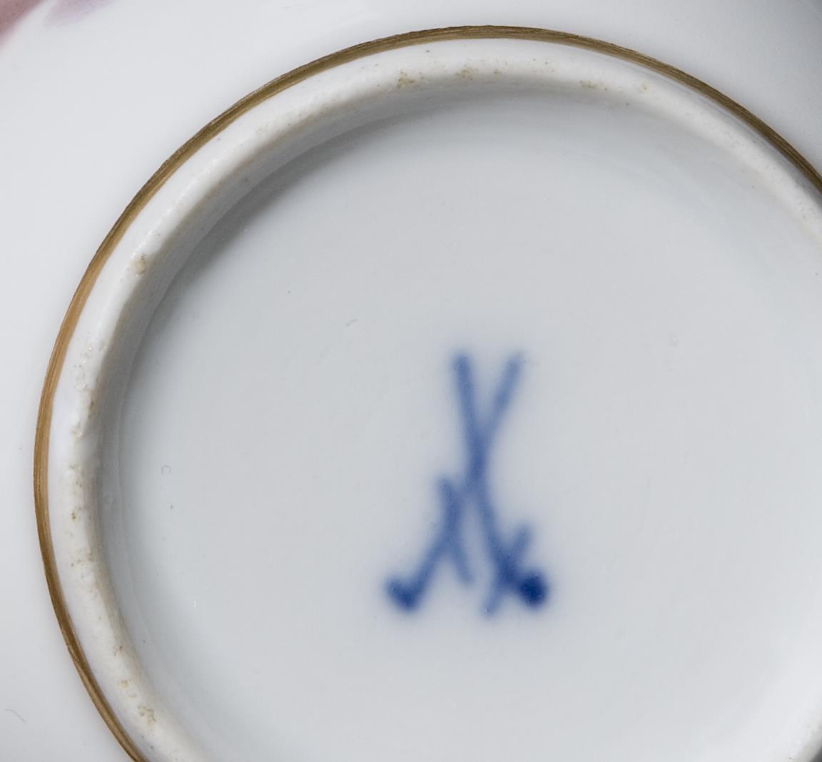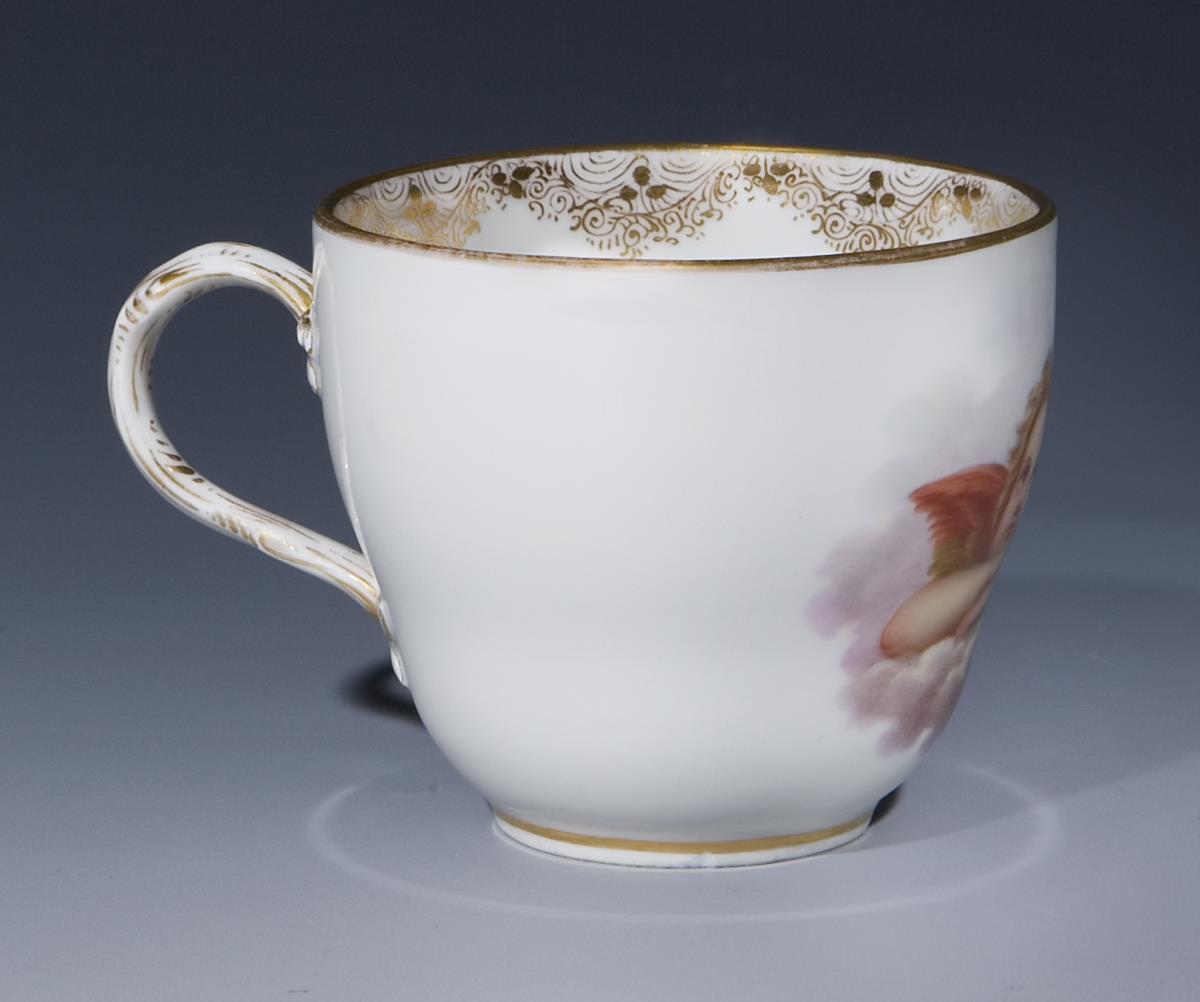 Engel nach Raffael, Ausschnitt aus dem Gemälde "Die Sixtinische Madonna". Goldspitzenbordüren, Goldrosette, Goldstaffage, feine farbige Bemalung. Bechertasse mit Asthenkel an reliefierten Blüten. Pressmarke, Schwertermarken 1. Wahl.