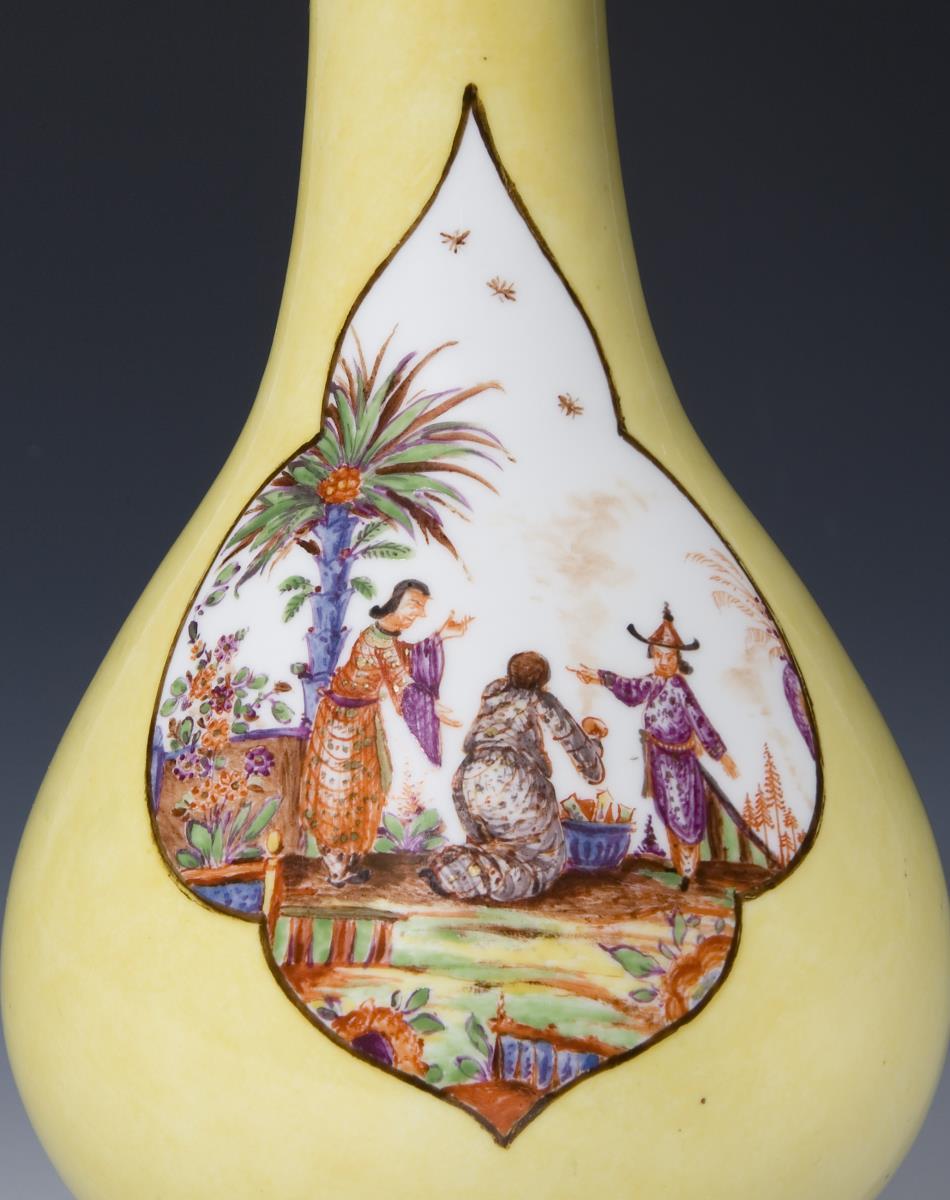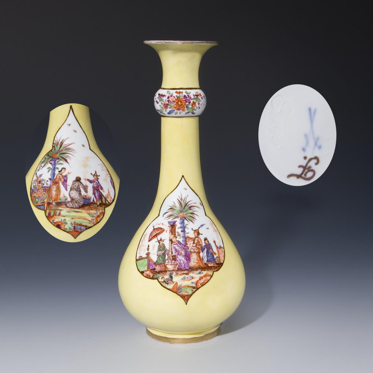 Beidseits 4-passig geschweifte Reserven mit "Chinoiserien" nach Johann Gregorius Höroldt. Am Hals umlaufend indianische Blumen. Farbig bemalt, kapuzinerbraun und gold staffiert. Ritzmarke, Pressmarke, goldene Malermarke F, Schwertermarke 1. Wahl.